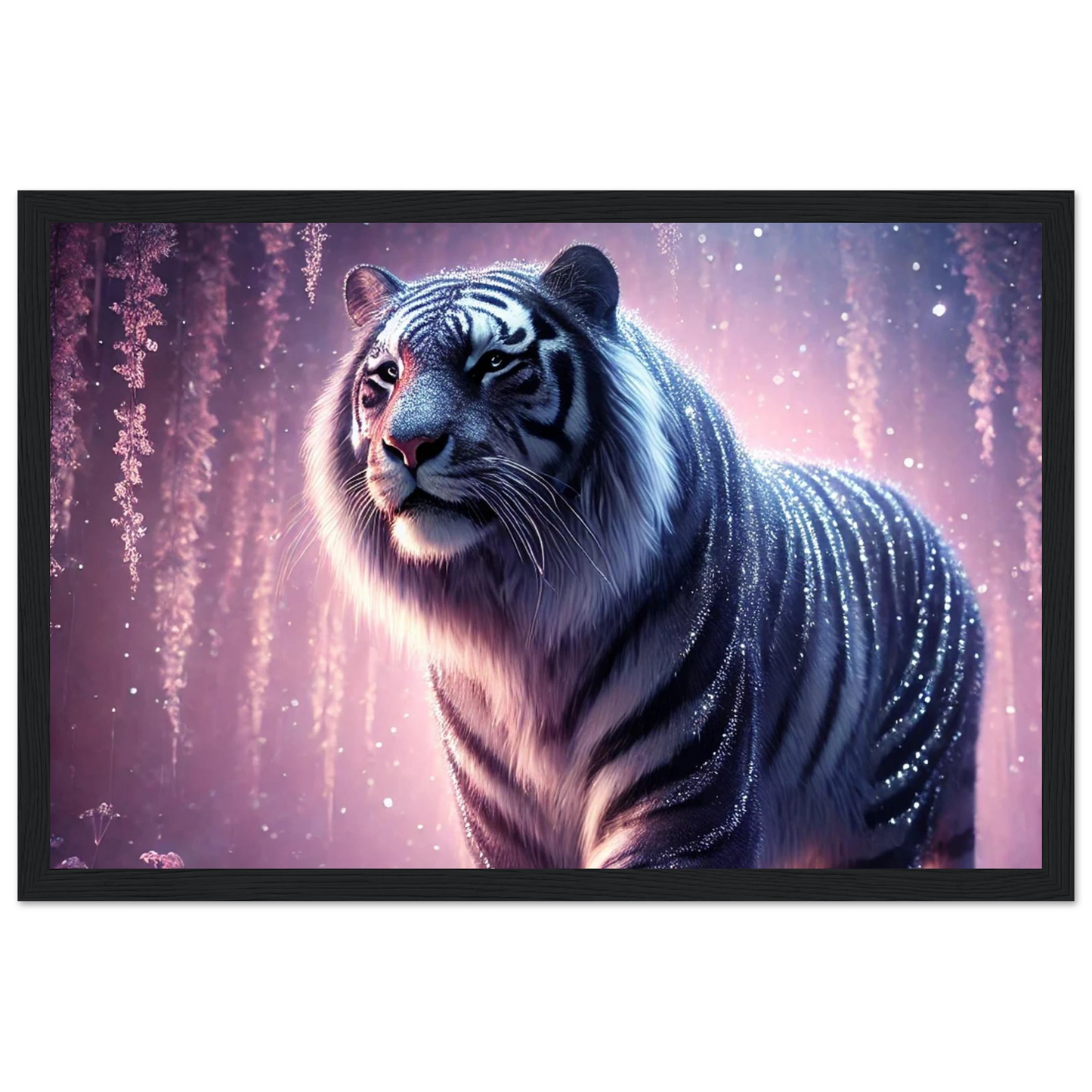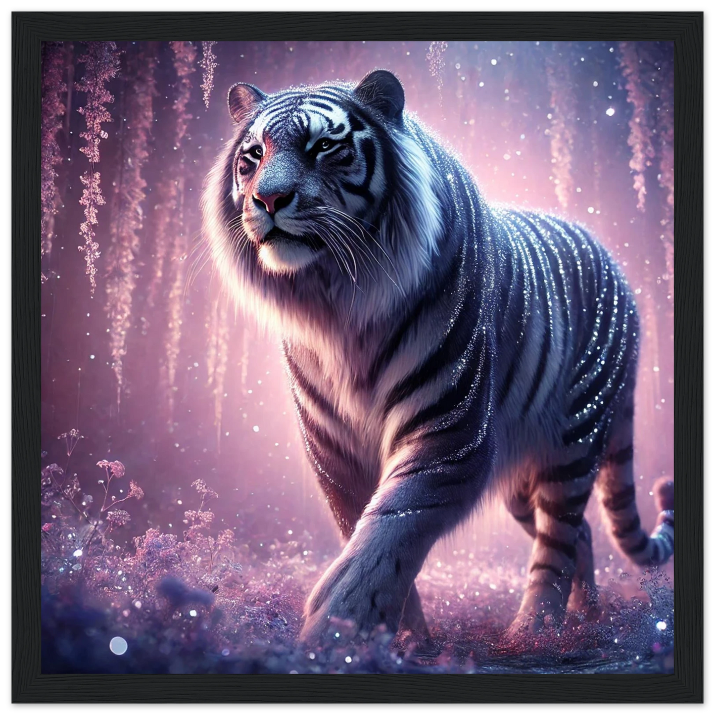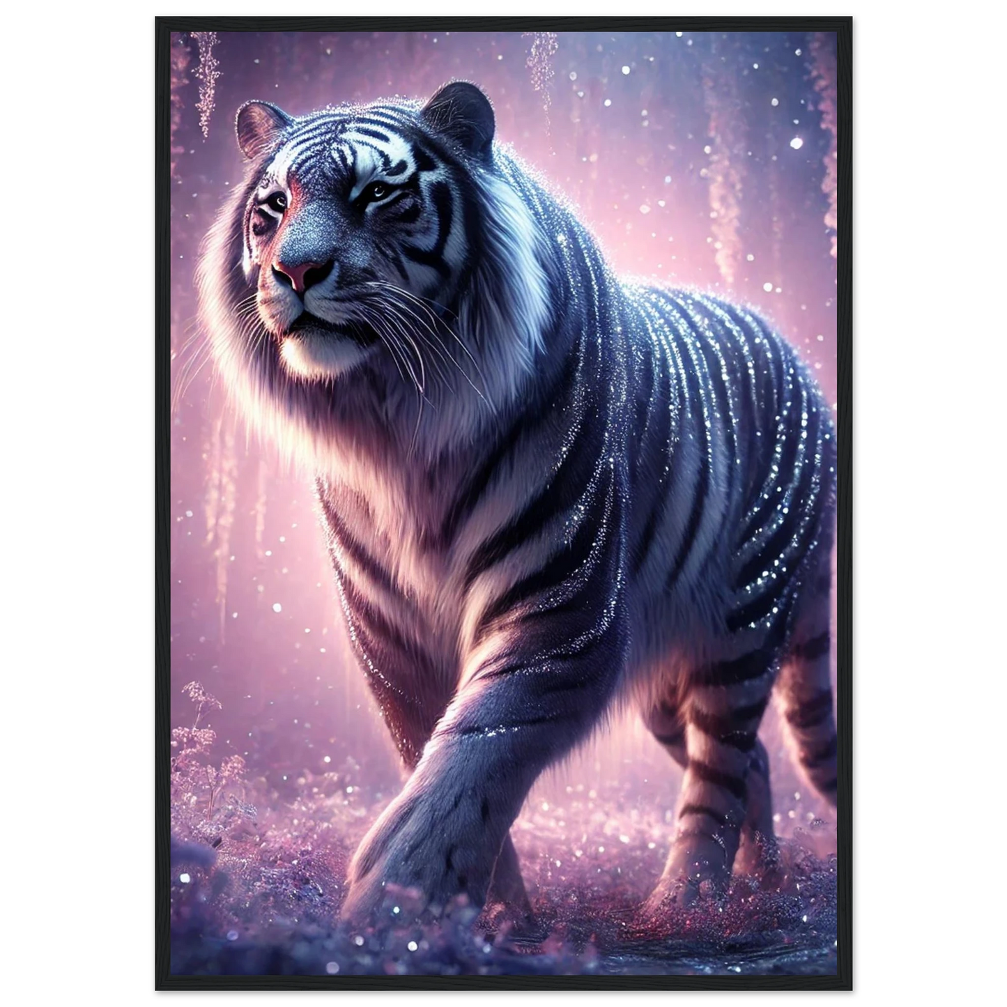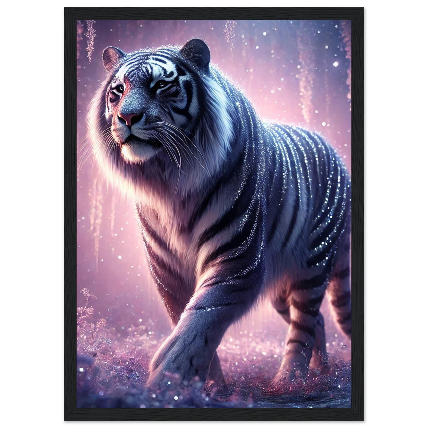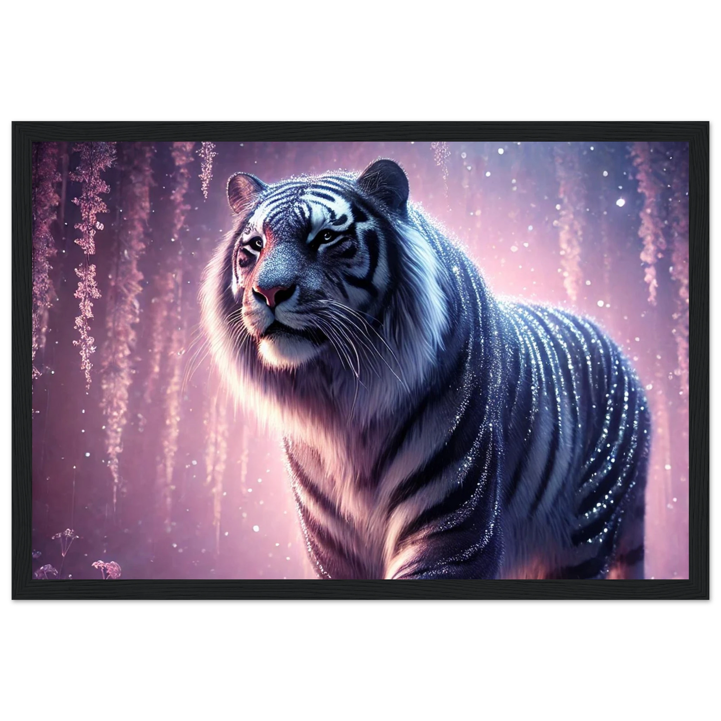 Nyaro ist ein silberner Tiger, dessen Fell wie von funkelndem Kristallstaub überzogen ist. Er wandelt durch einen Traumwald voller hängender Kristallblüten und schimmerndem Nebel. Als Hüter der Stille schenkt er Harmonie und inneren Frieden – und wer ihm begegnet, trägt seine Weisheit still im Herzen.
