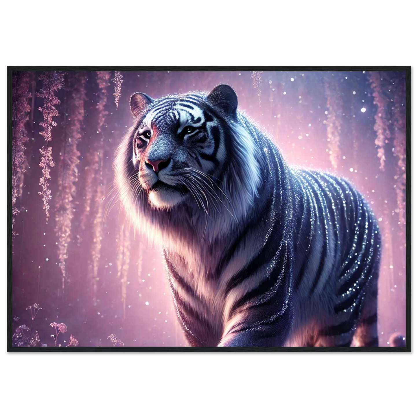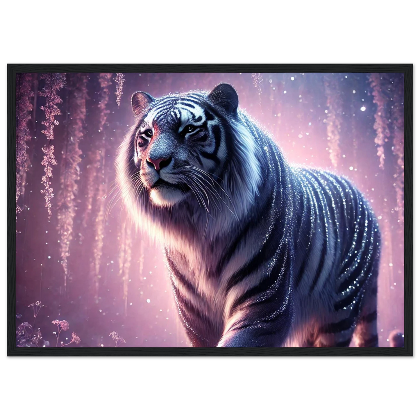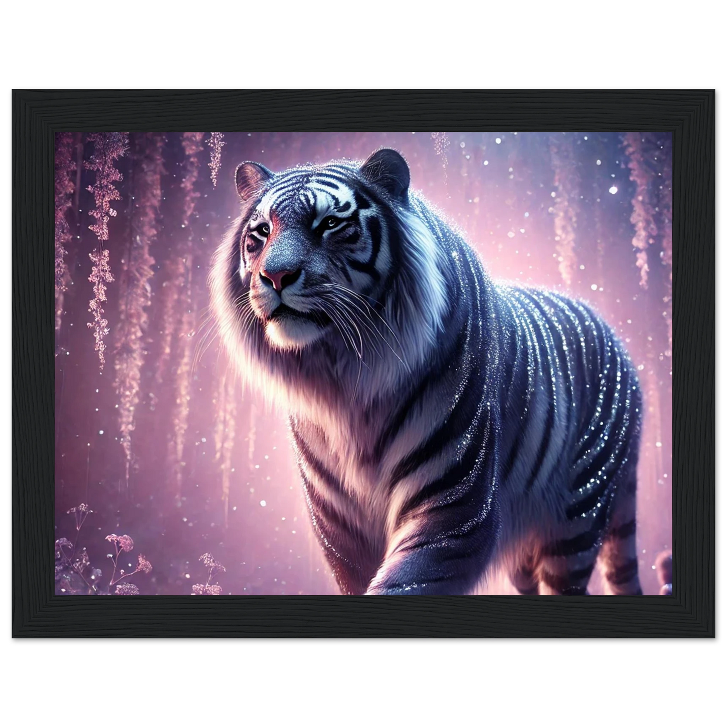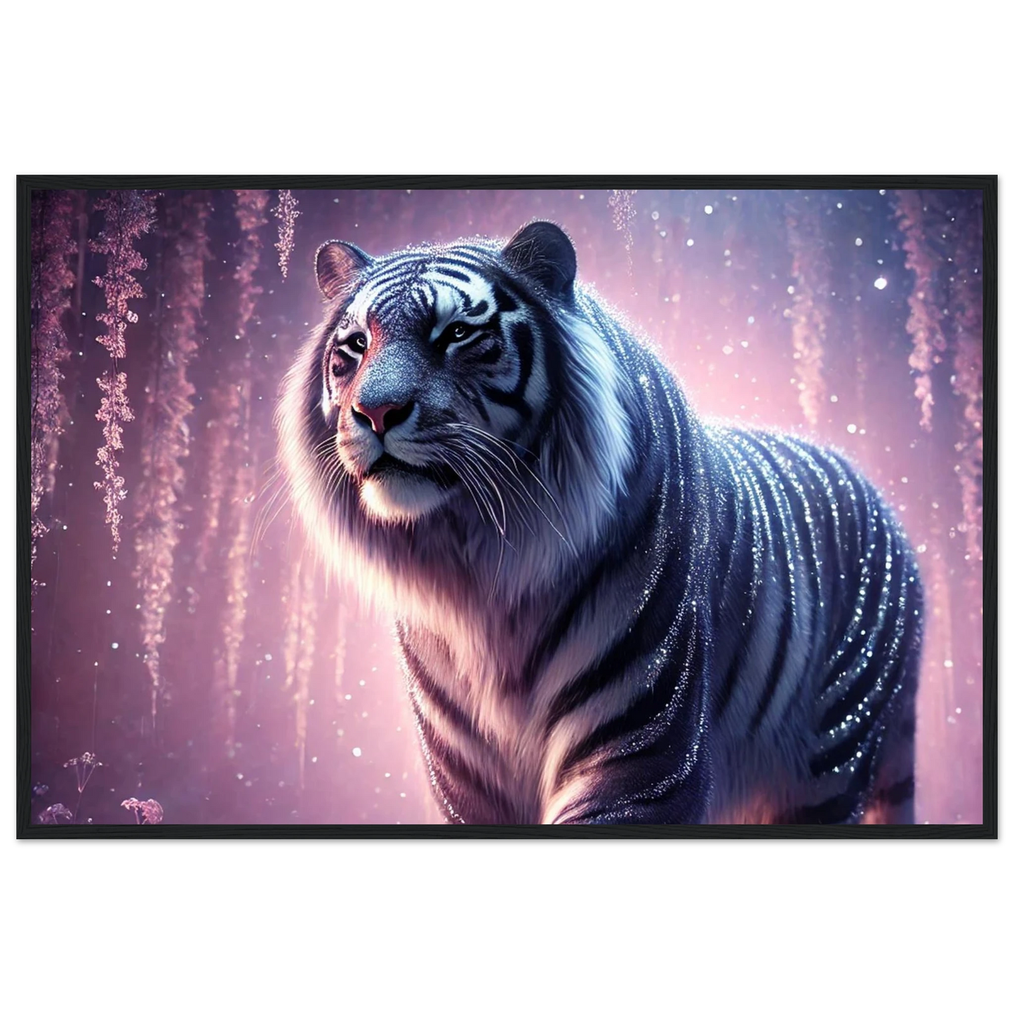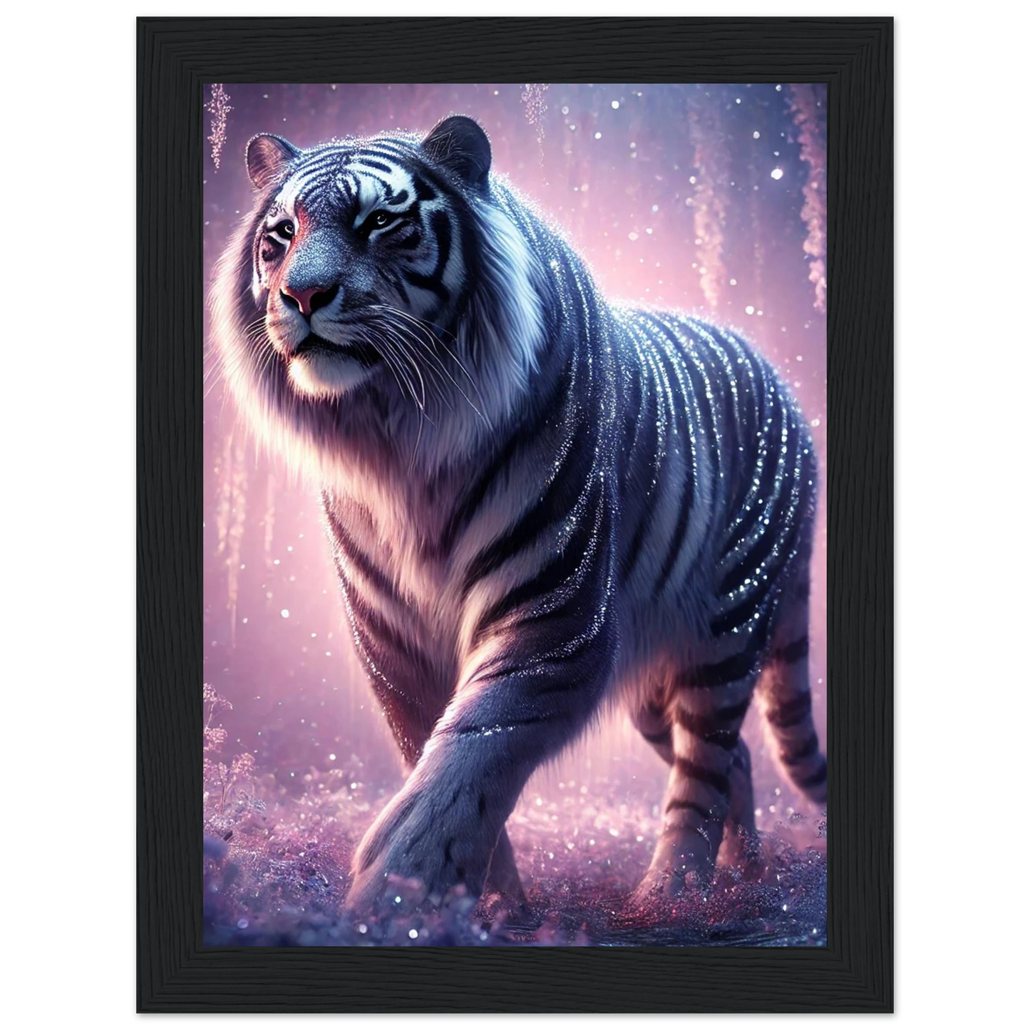 Nyaro ist ein silberner Tiger, dessen Fell wie von funkelndem Kristallstaub überzogen ist. Er wandelt durch einen Traumwald voller hängender Kristallblüten und schimmerndem Nebel. Als Hüter der Stille schenkt er Harmonie und inneren Frieden – und wer ihm begegnet, trägt seine Weisheit still im Herzen.