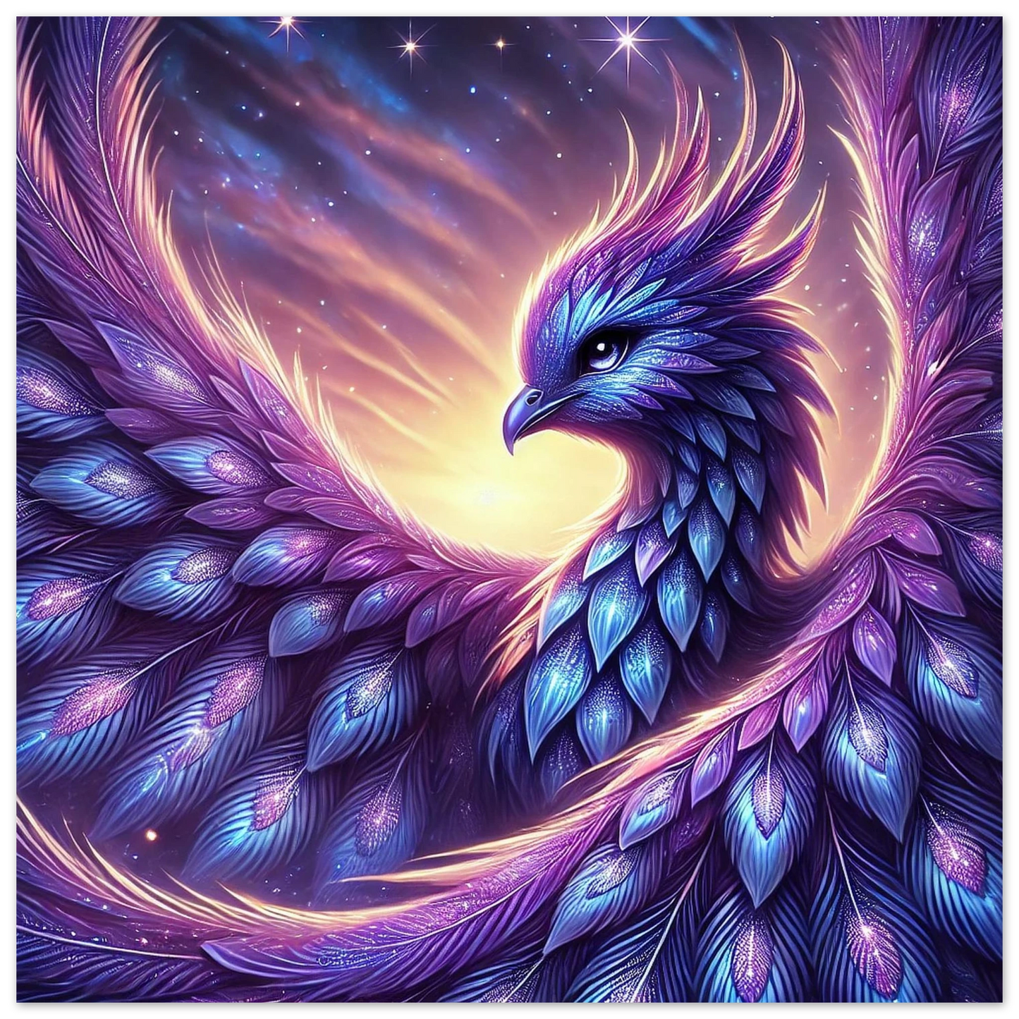 Leicht, modern und eindrucksvoll – Nyraella, die Flamme der Dämmerung, erstrahlt auf elegantem Schaumstoffdruck in brillanten Farben. Ihr majestätisches violett-blaues Gefieder, das an schimmernde Sternenflammen erinnert, wirkt lebendig und kraftvoll, während das moderne Material ein stilvolles und zugleich federleichtes Finish bietet.