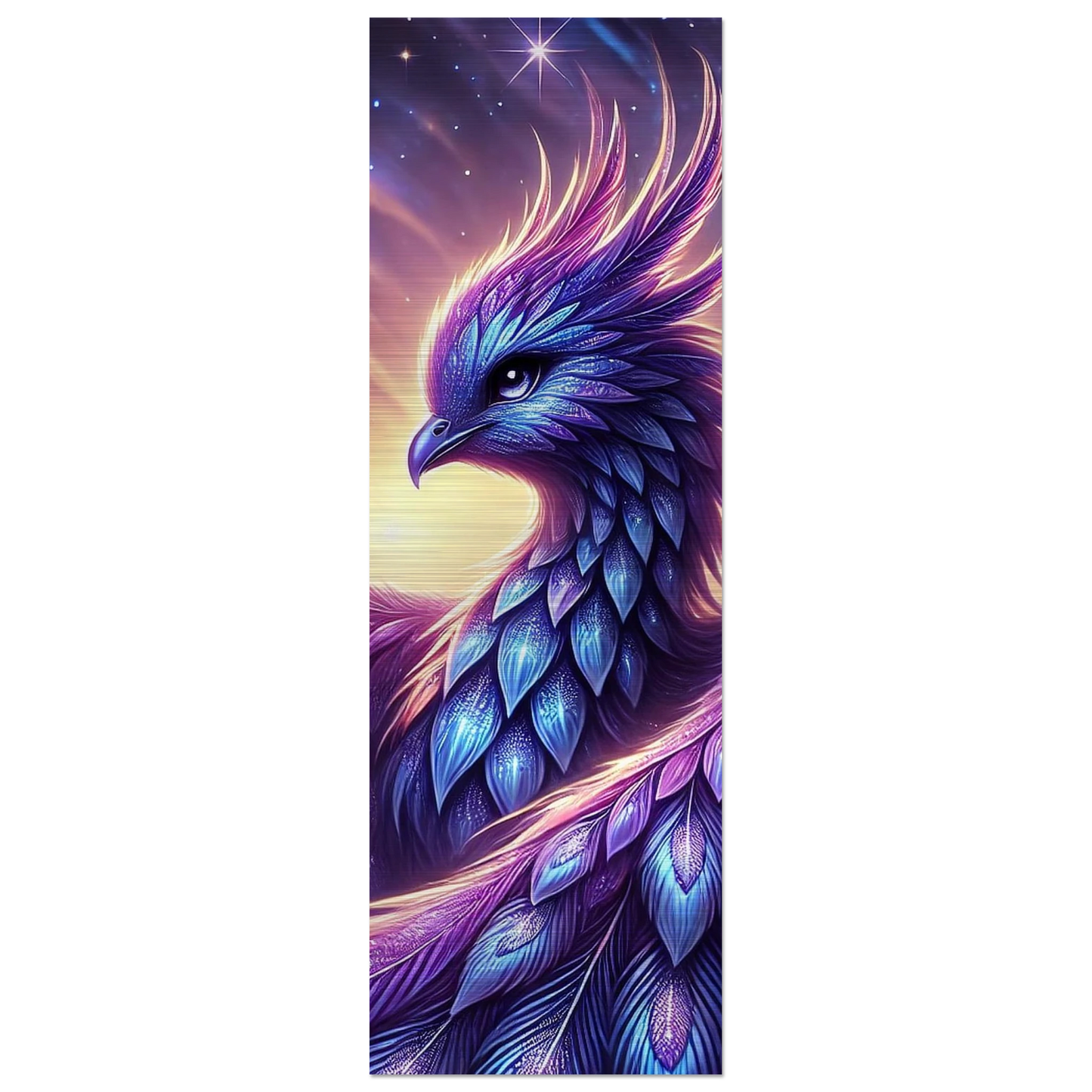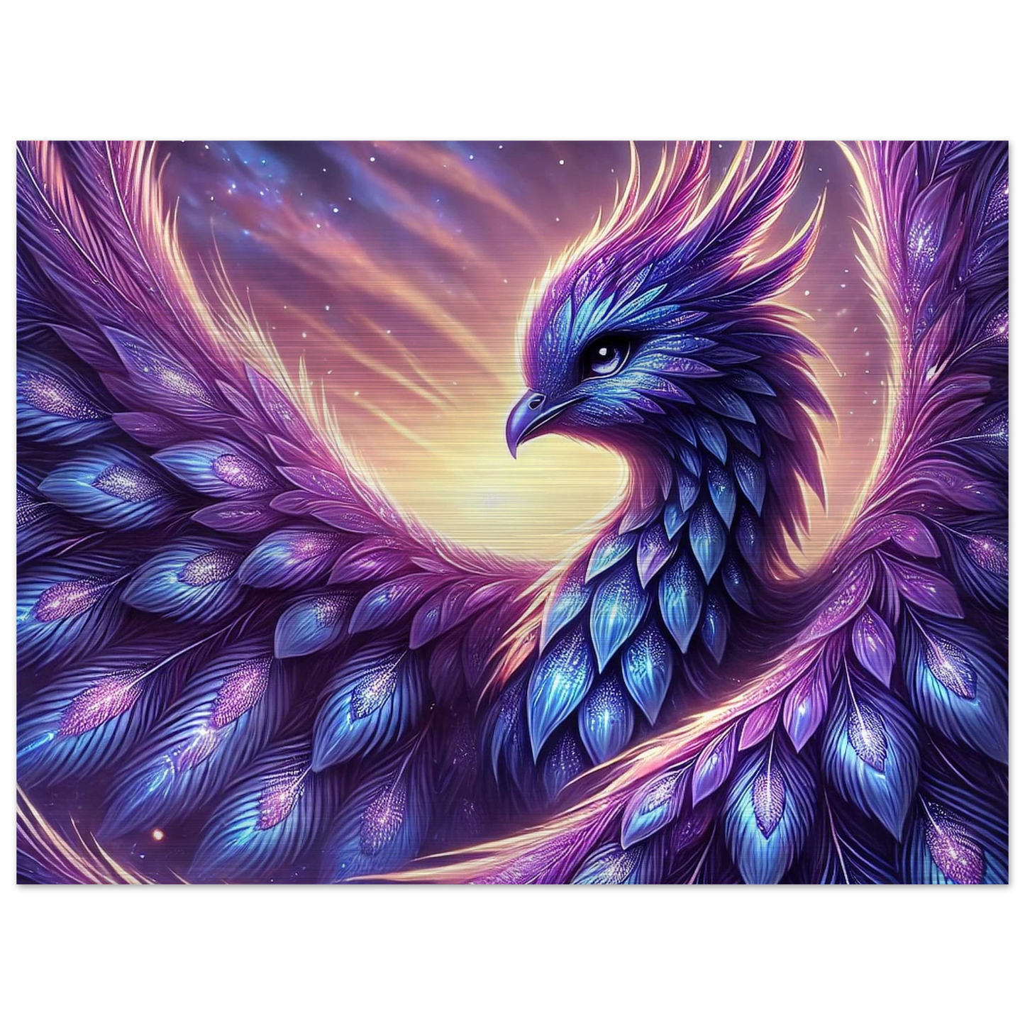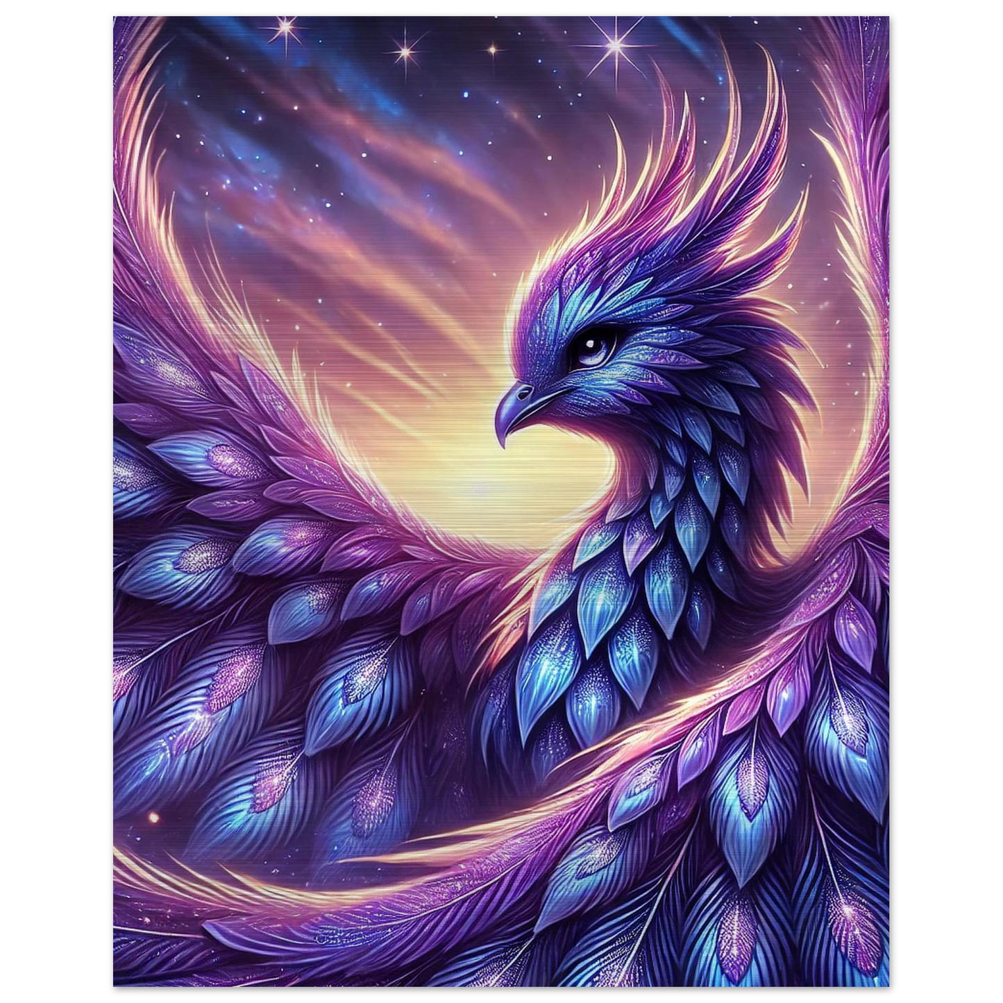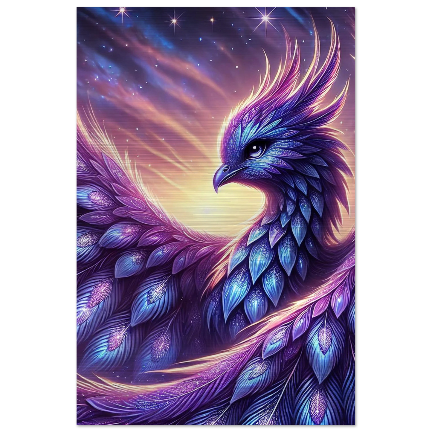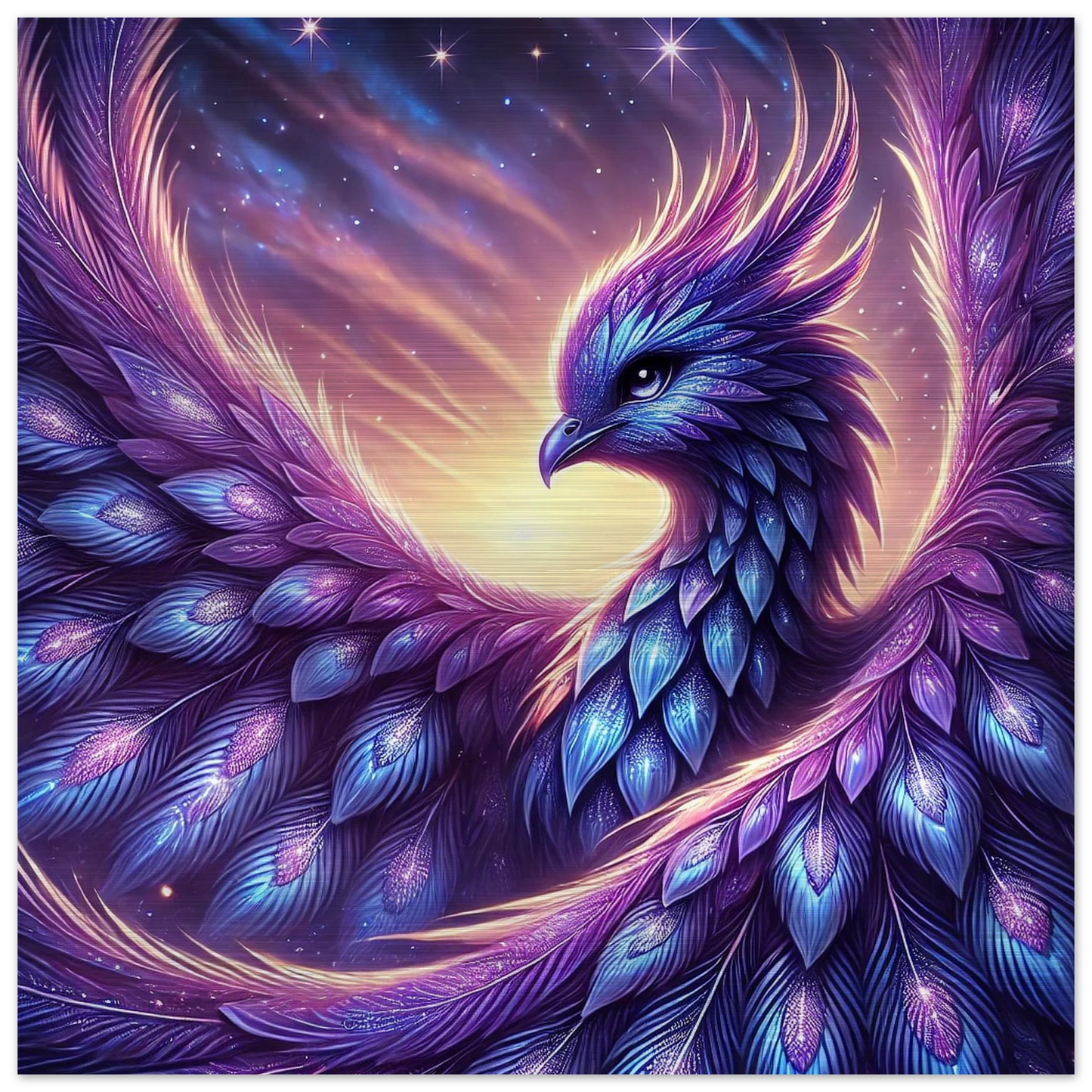Wenn Tag und Nacht einander begegnen, erhebt sich Nyraella – ein kosmischer Phönix, geboren aus einem verglühenden Stern. Ihr violett-blaues Gefieder trägt die Melodie des Universums, und ihre Flügel tauchen den Himmel in Farben, die noch kein Auge gesehen hat. Nur in den wenigen Minuten der Dämmerung erscheint sie – und wer sie erblickt, darf sich einen Wunsch aus reinem Herzen wünschen.