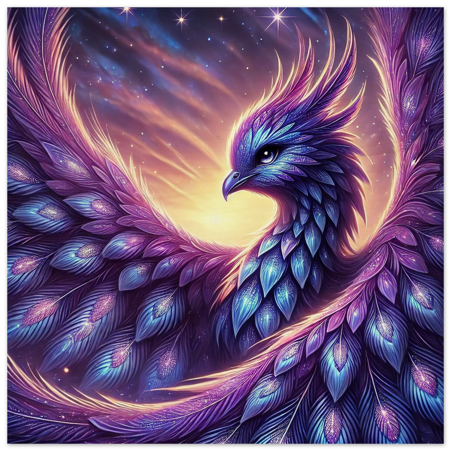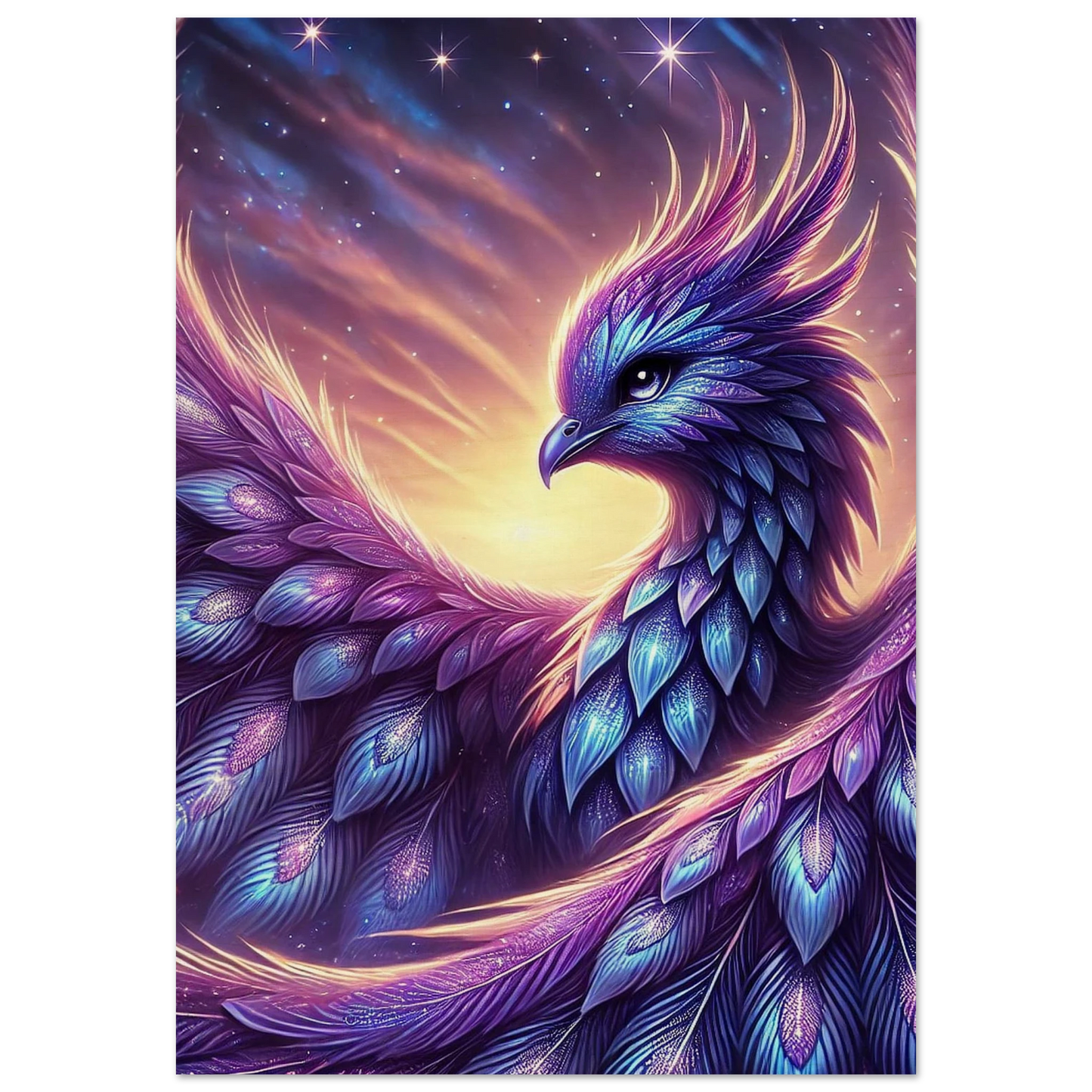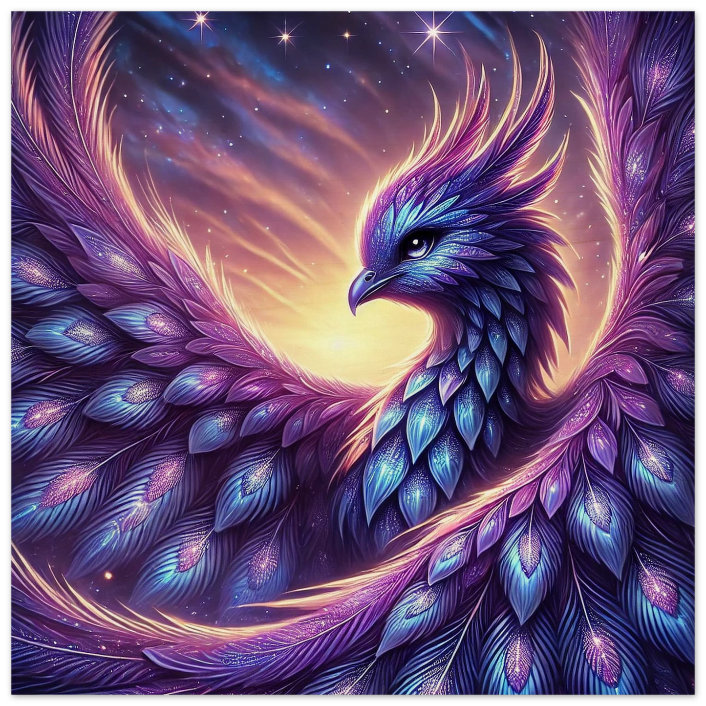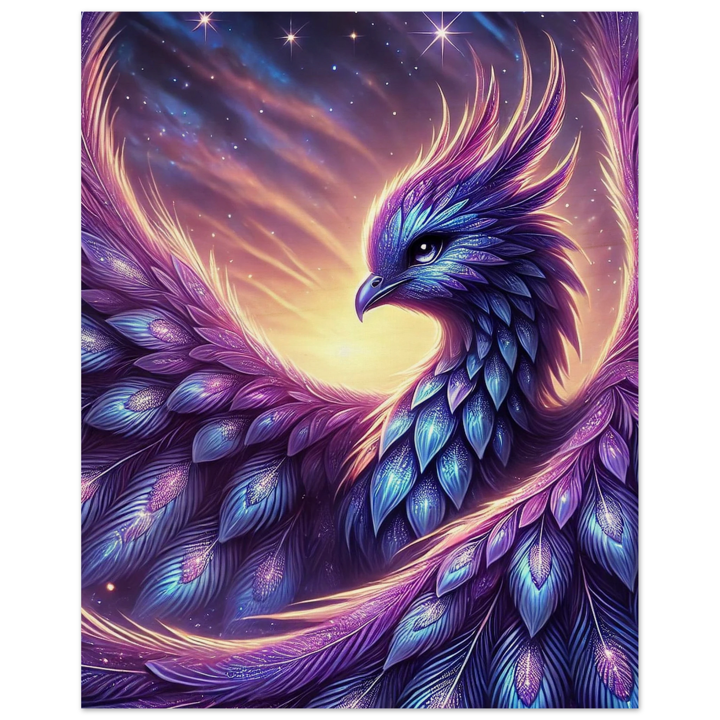 Nyraella als Holzdruck vereint die zeitlose Schönheit von Naturmaterialien mit der mystischen Energie eines kosmischen Phönix – ein Highlight für alle, die Natürlichkeit und Fantasie in ihren Räumen verbinden möchten.
