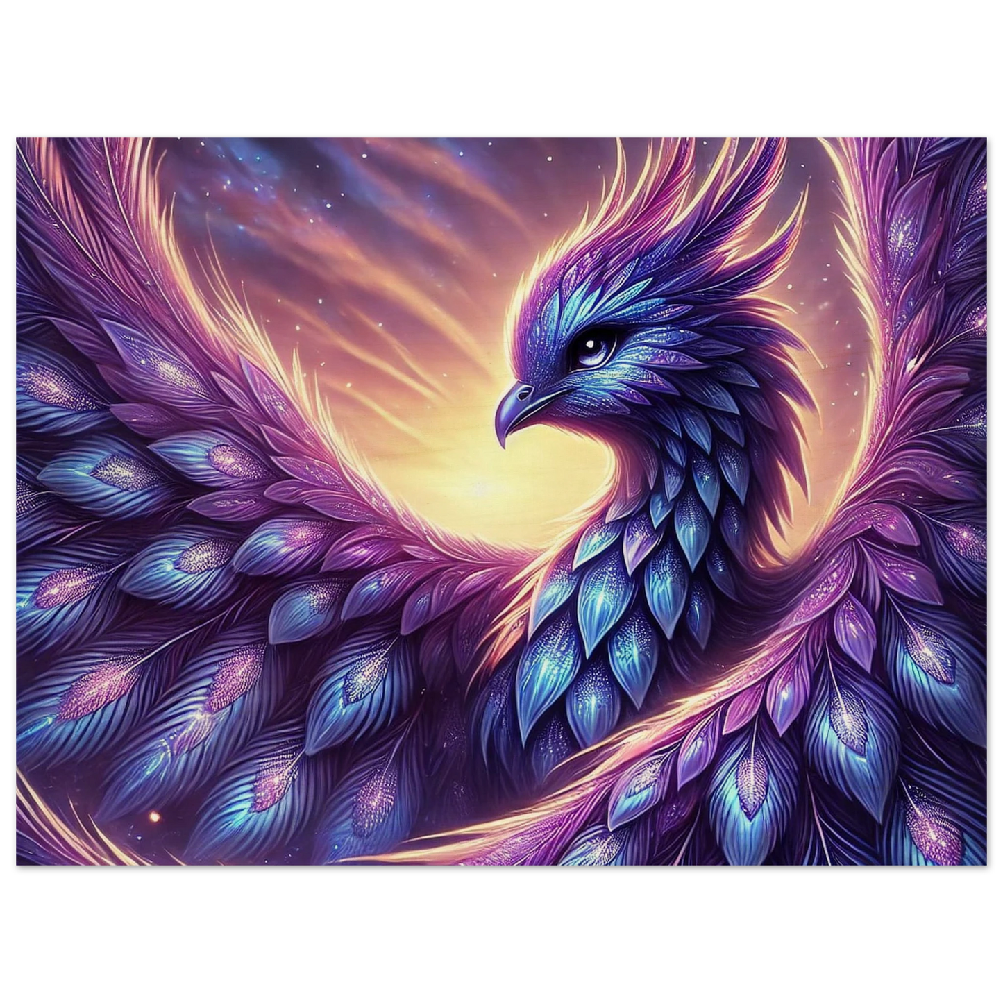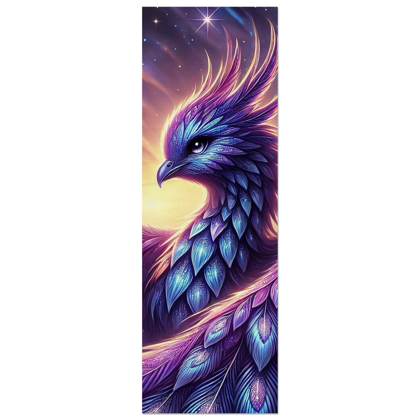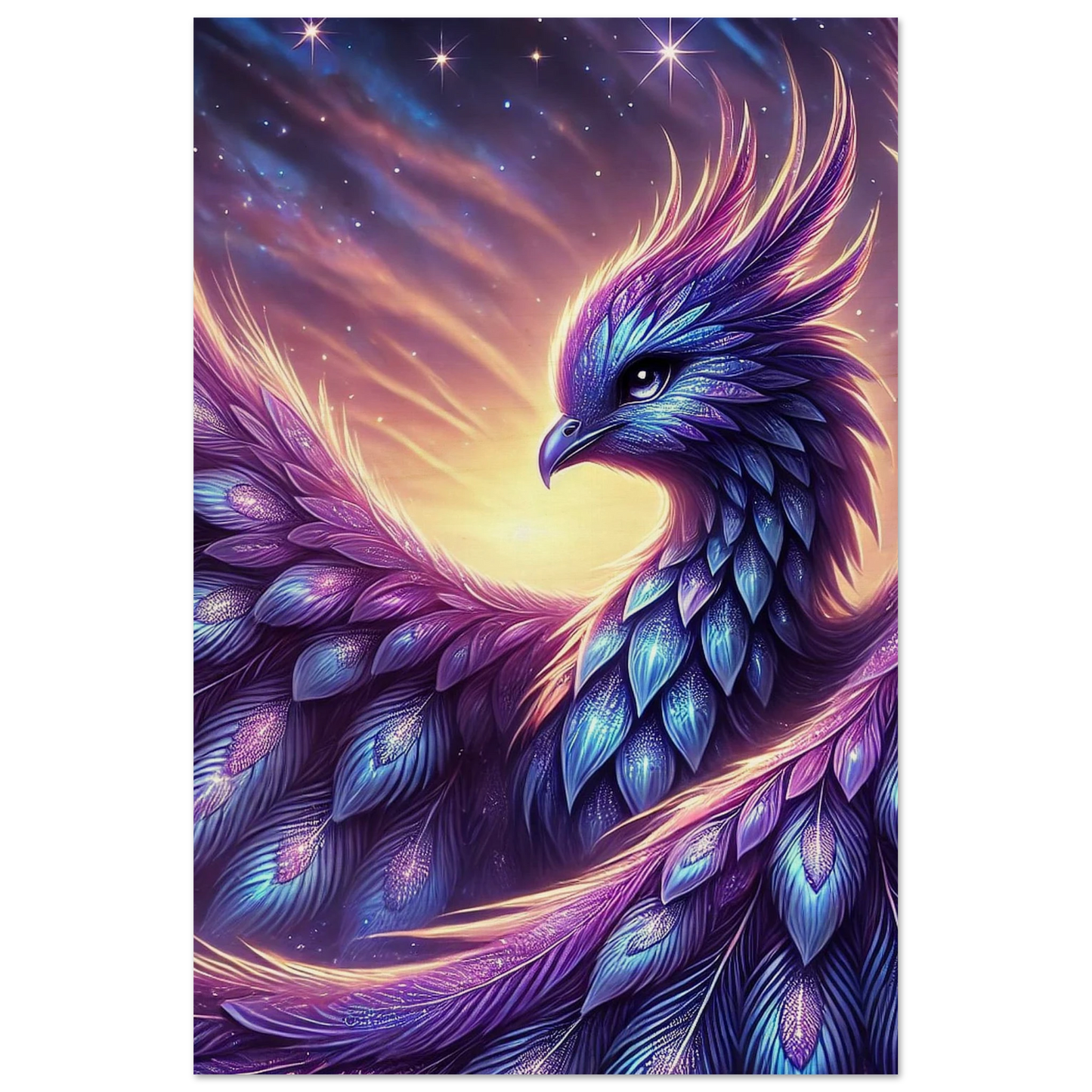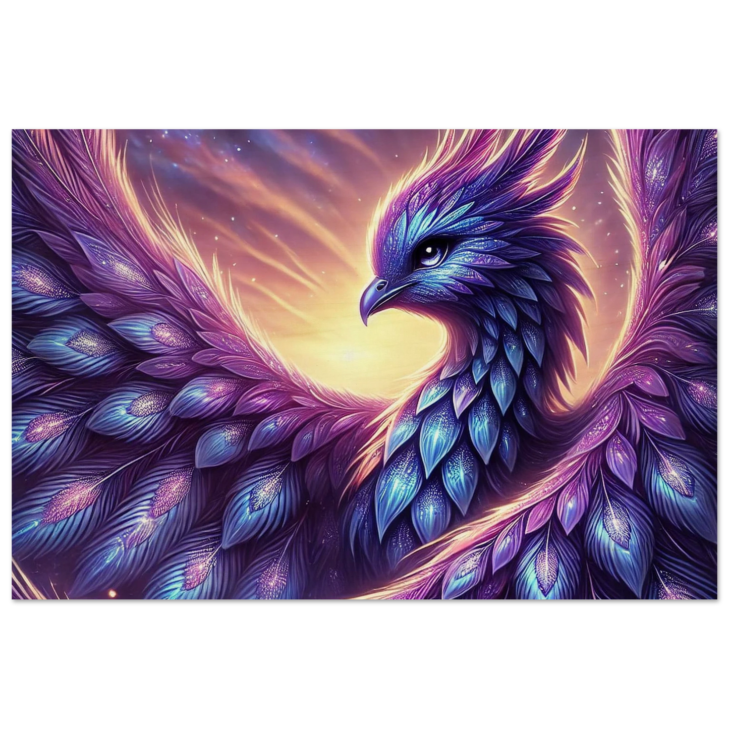 Nyraella als Holzdruck vereint die zeitlose Schönheit von Naturmaterialien mit der mystischen Energie eines kosmischen Phönix – ein Highlight für alle, die Natürlichkeit und Fantasie in ihren Räumen verbinden möchten.
