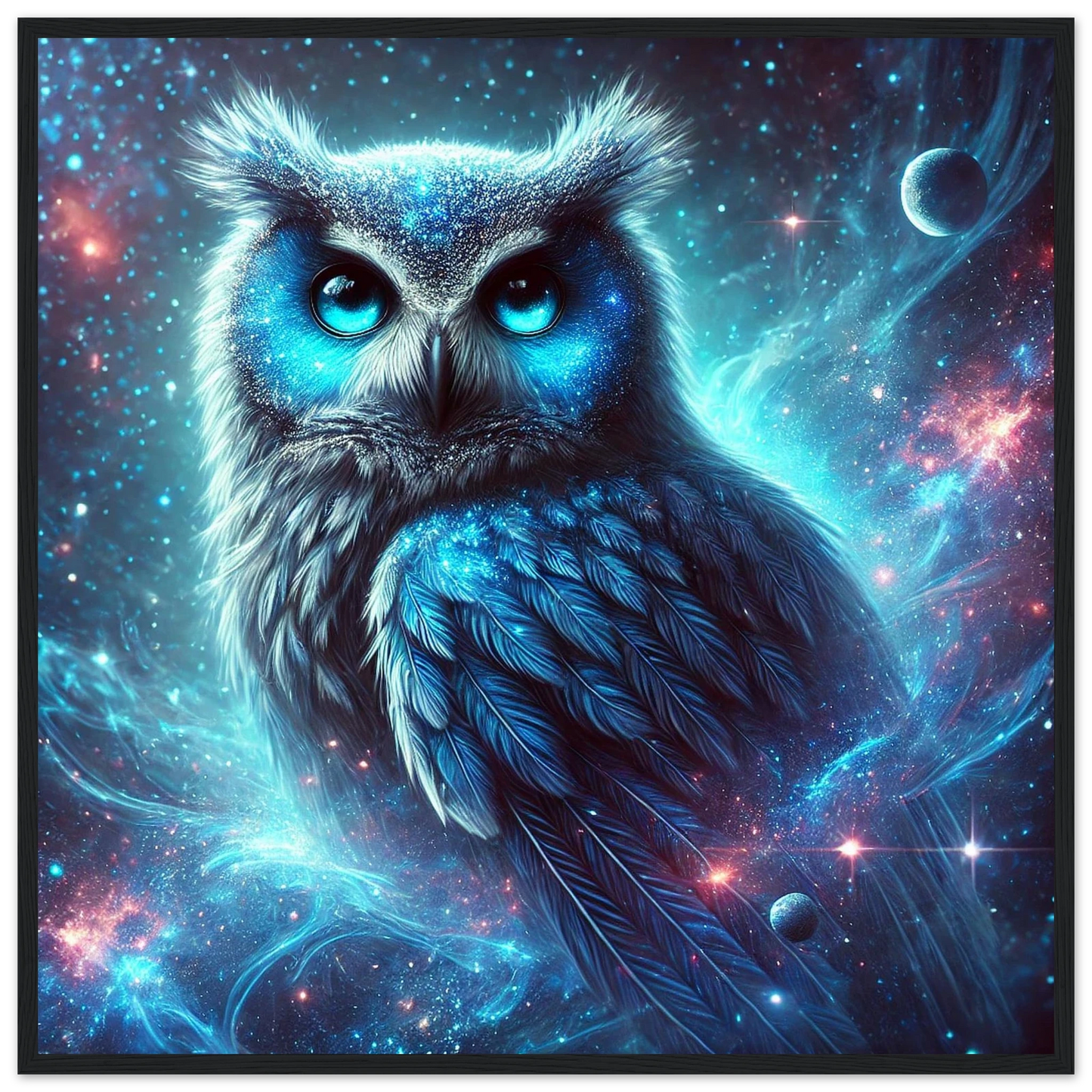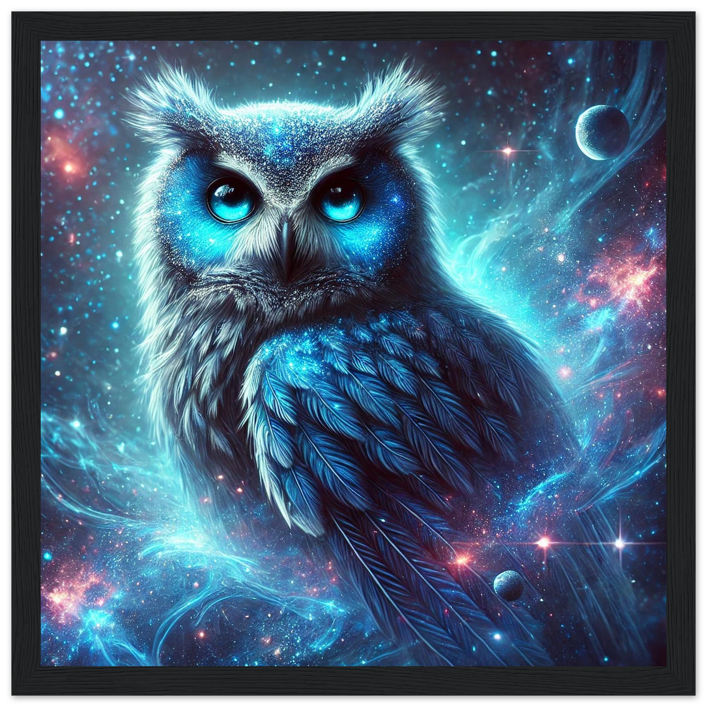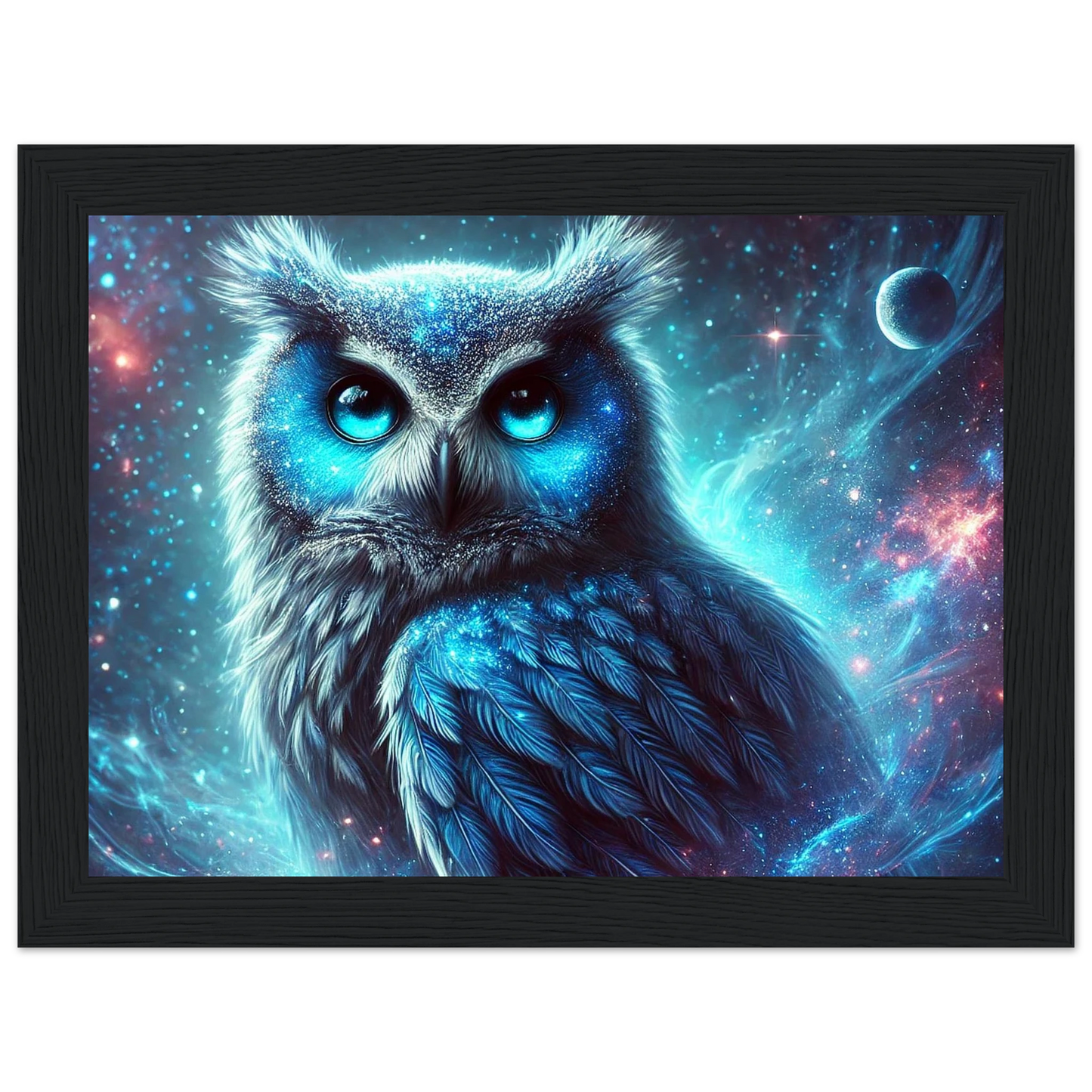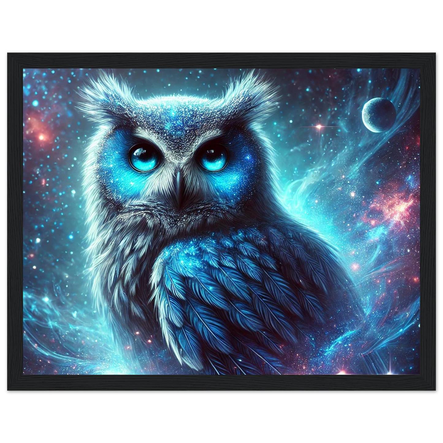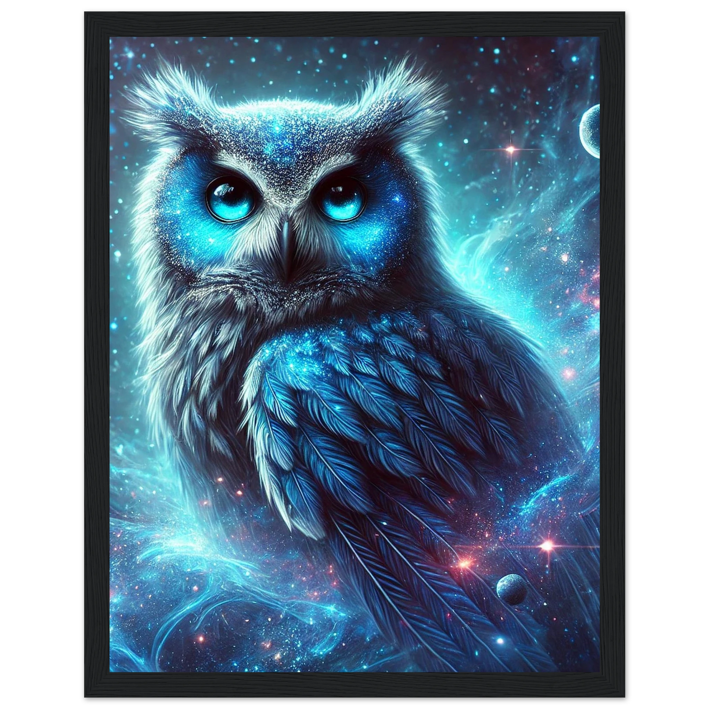 Dieser Holzrahmen-Kunstdruck vereint edle Handwerkskunst mit der kosmischen Legende von Nyxion – der Eule, die Weisheit bringt und die Sterne in dein Zuhause trägt.