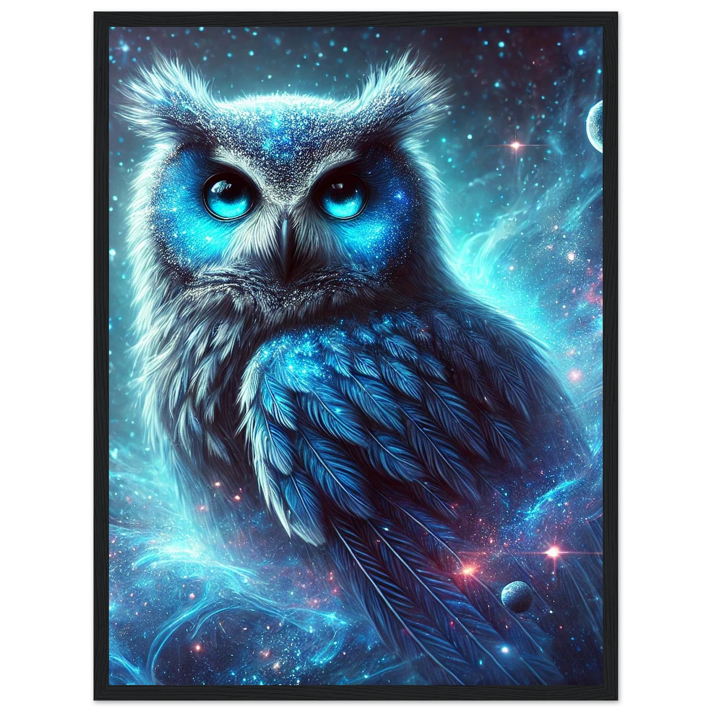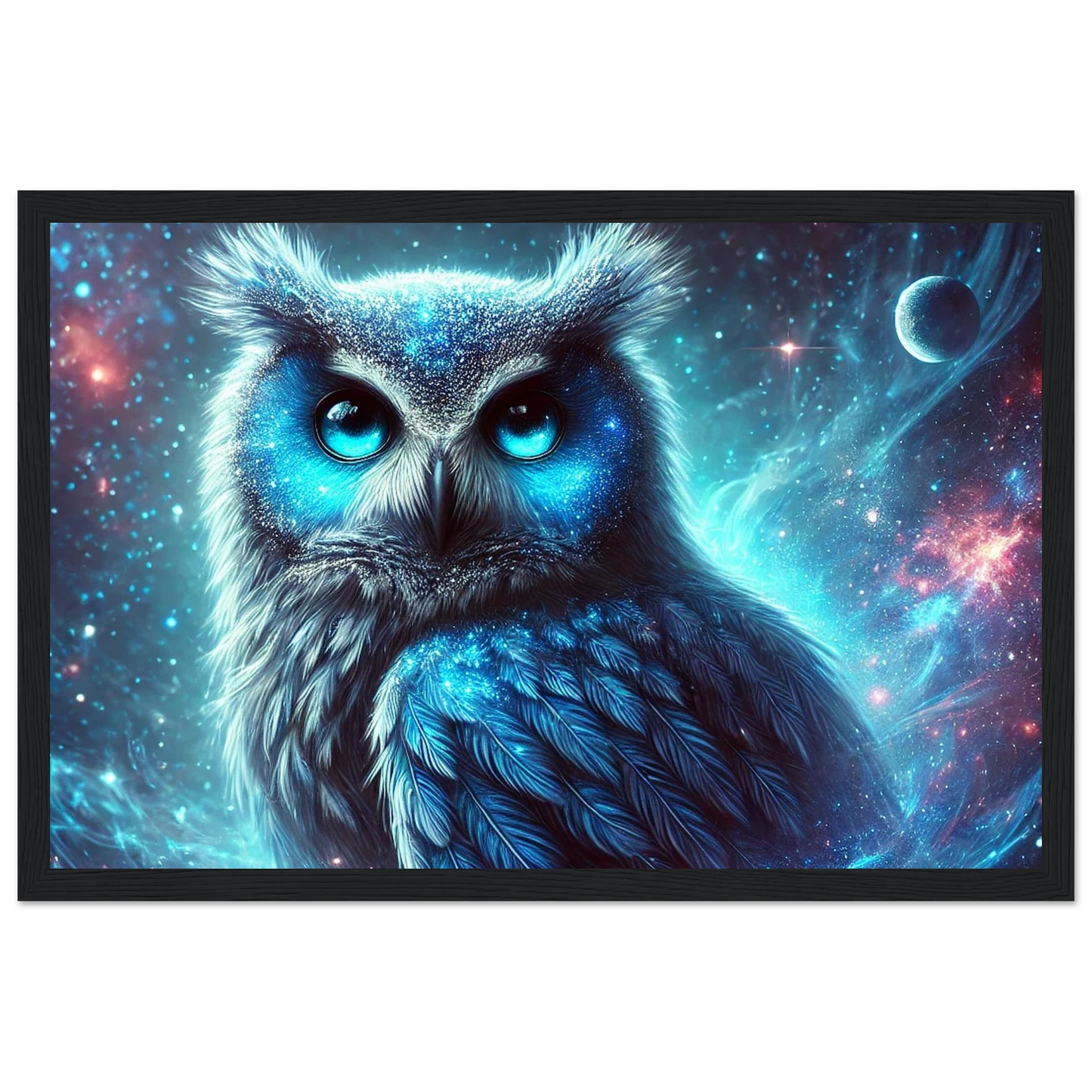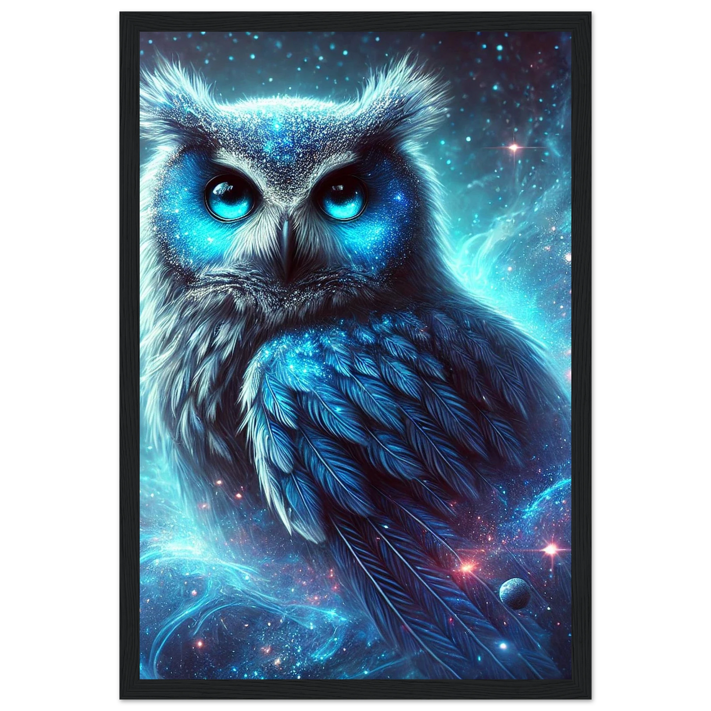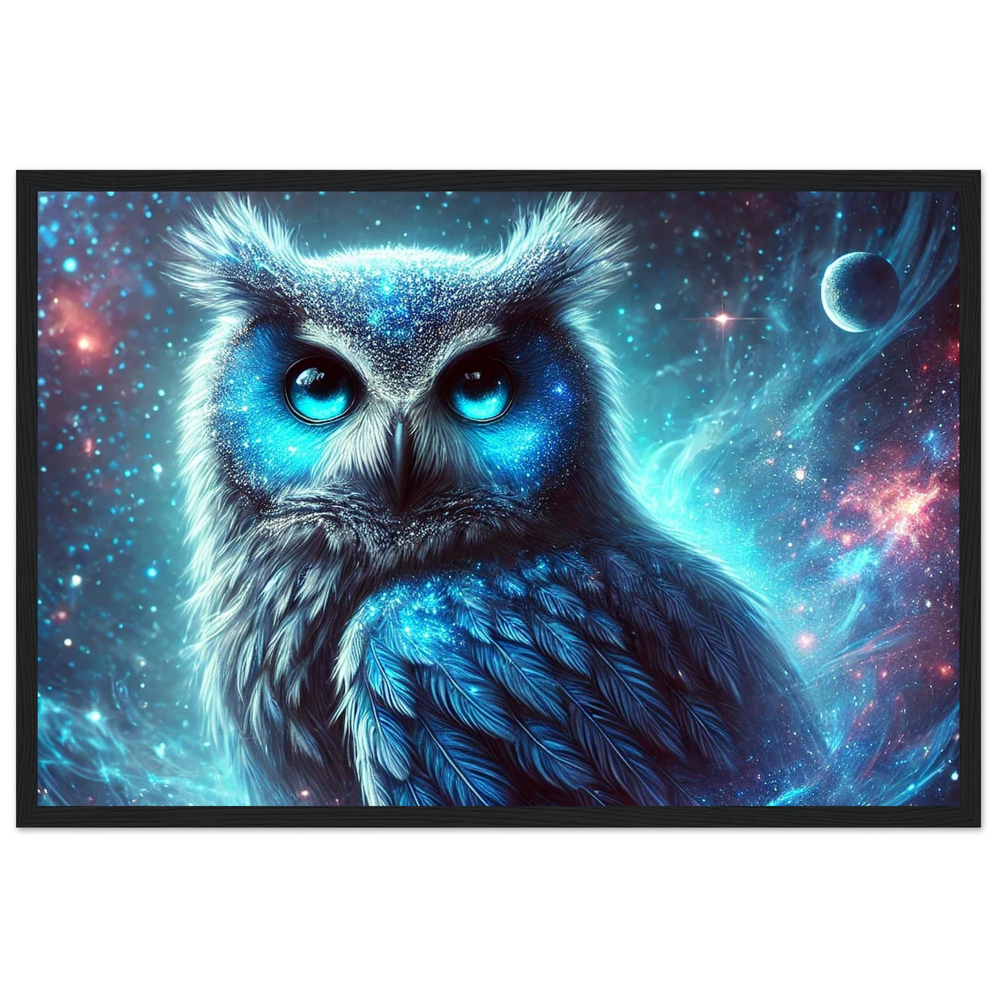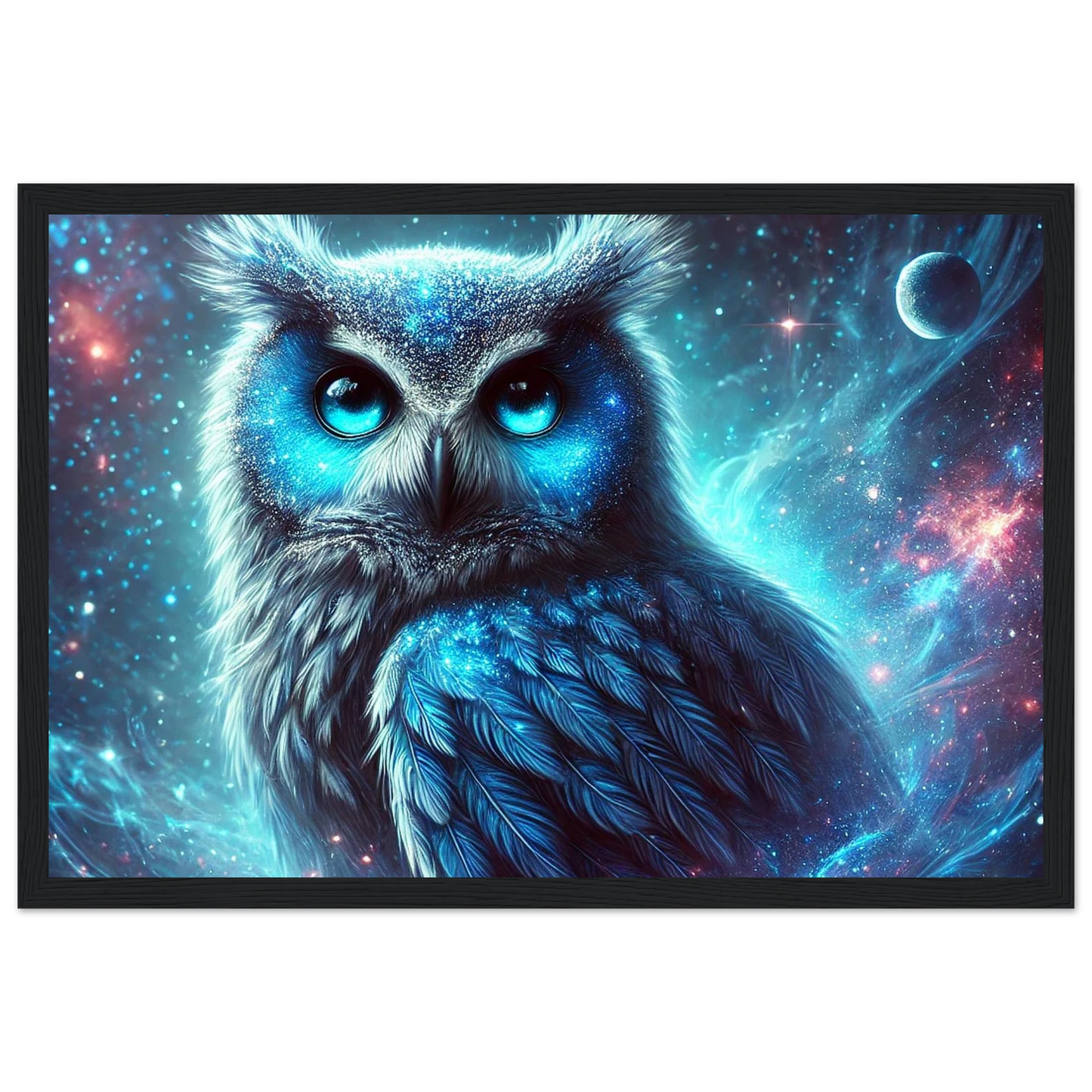 Dieser Holzrahmen-Kunstdruck vereint edle Handwerkskunst mit der kosmischen Legende von Nyxion – der Eule, die Weisheit bringt und die Sterne in dein Zuhause trägt.
