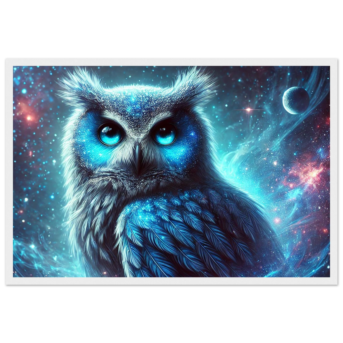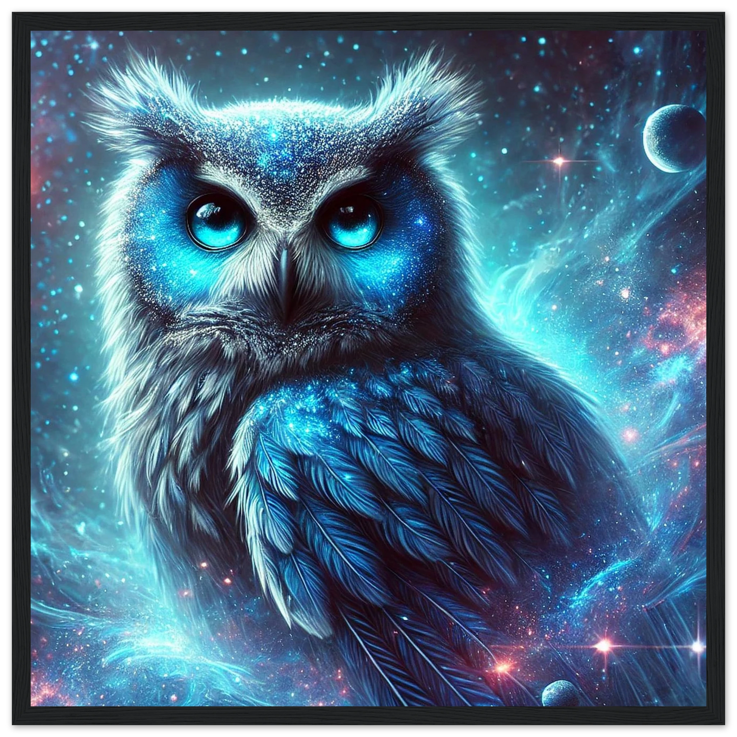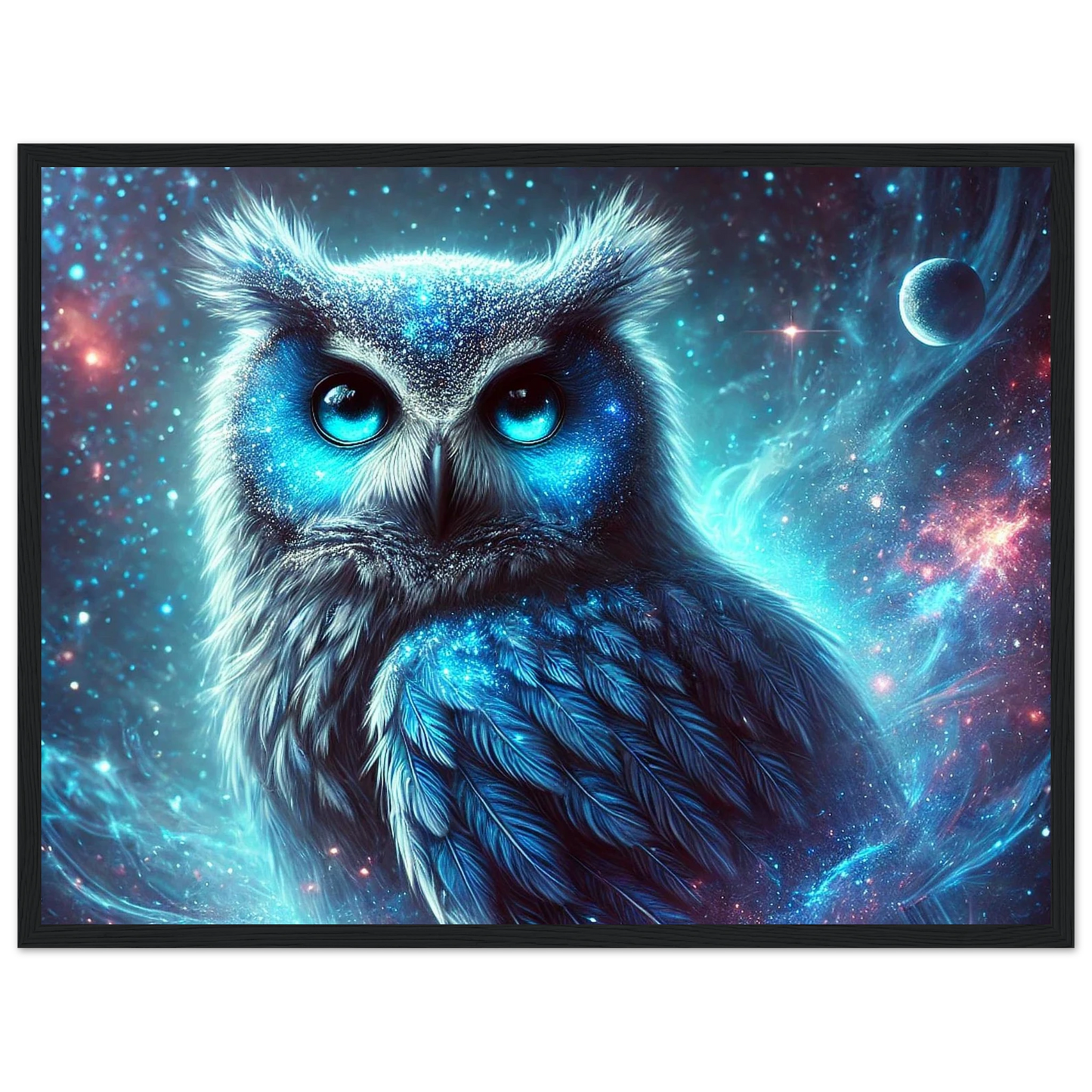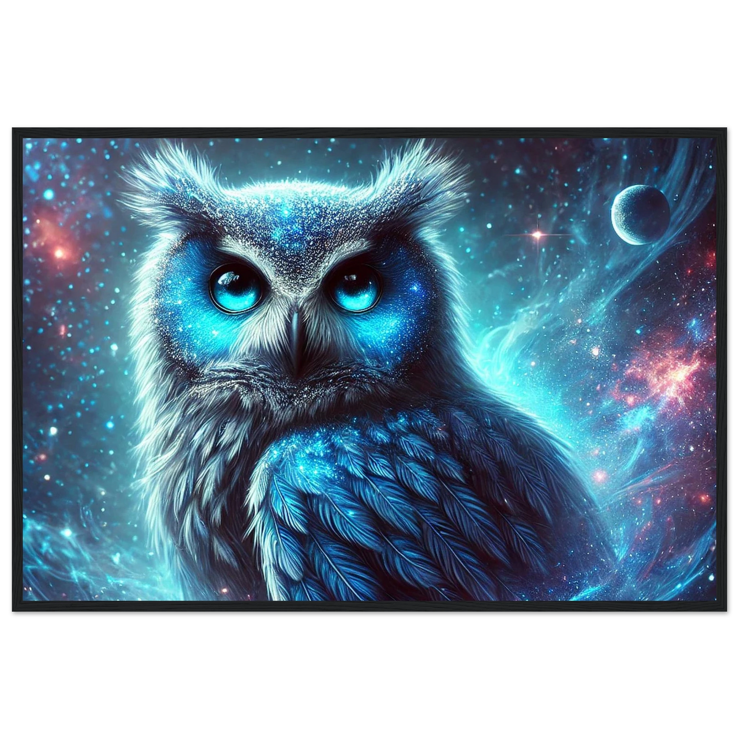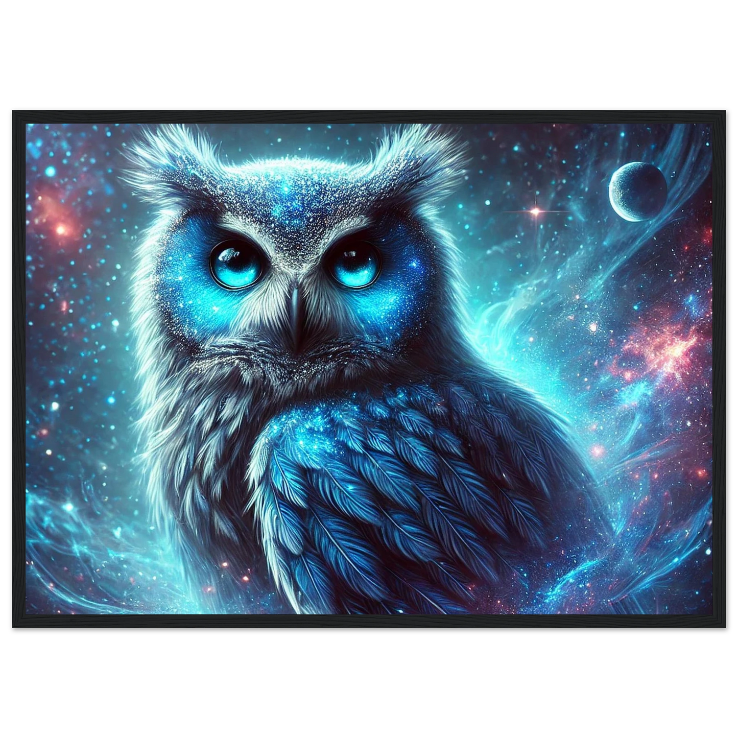 Dieser Holzrahmen-Kunstdruck vereint edle Handwerkskunst mit der kosmischen Legende von Nyxion – der Eule, die Weisheit bringt und die Sterne in dein Zuhause trägt.