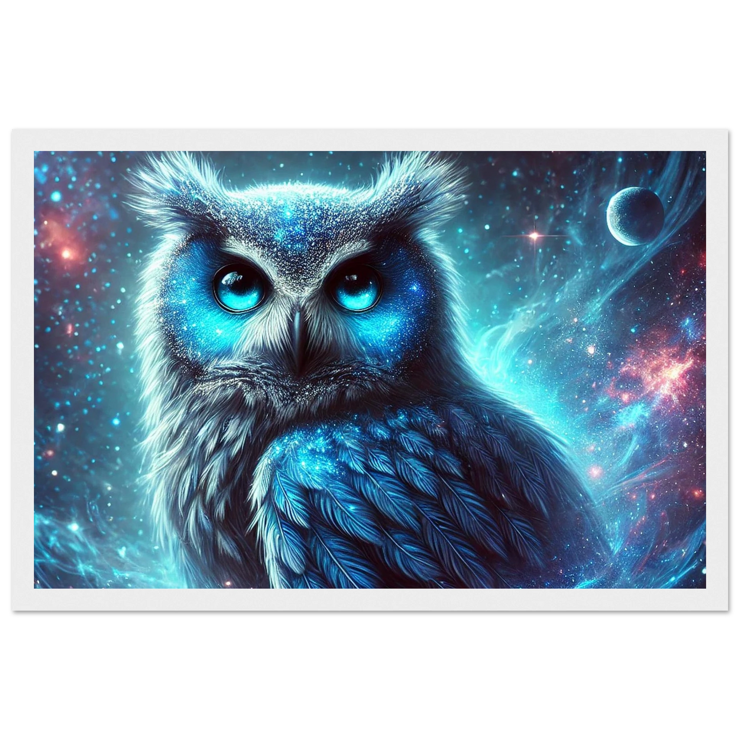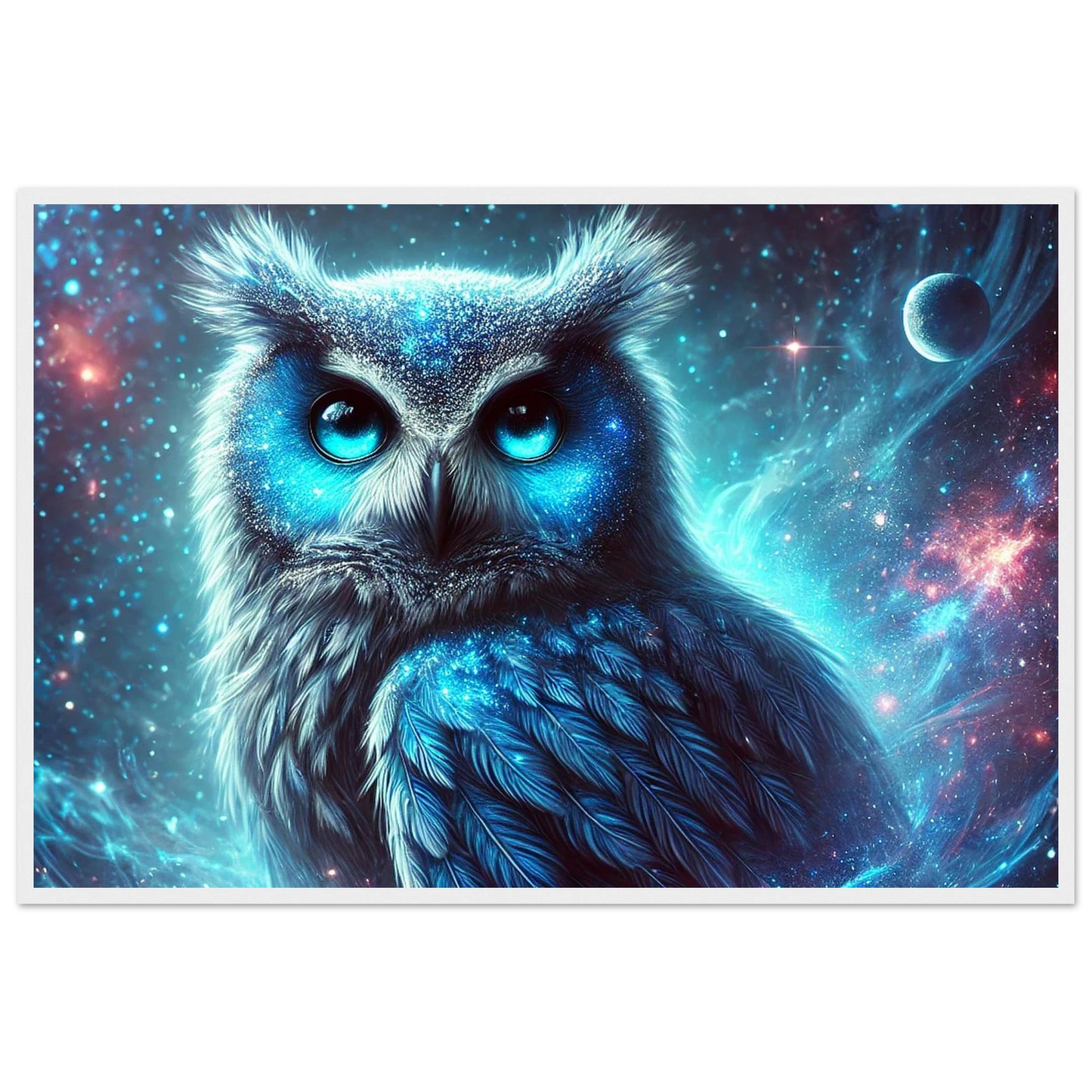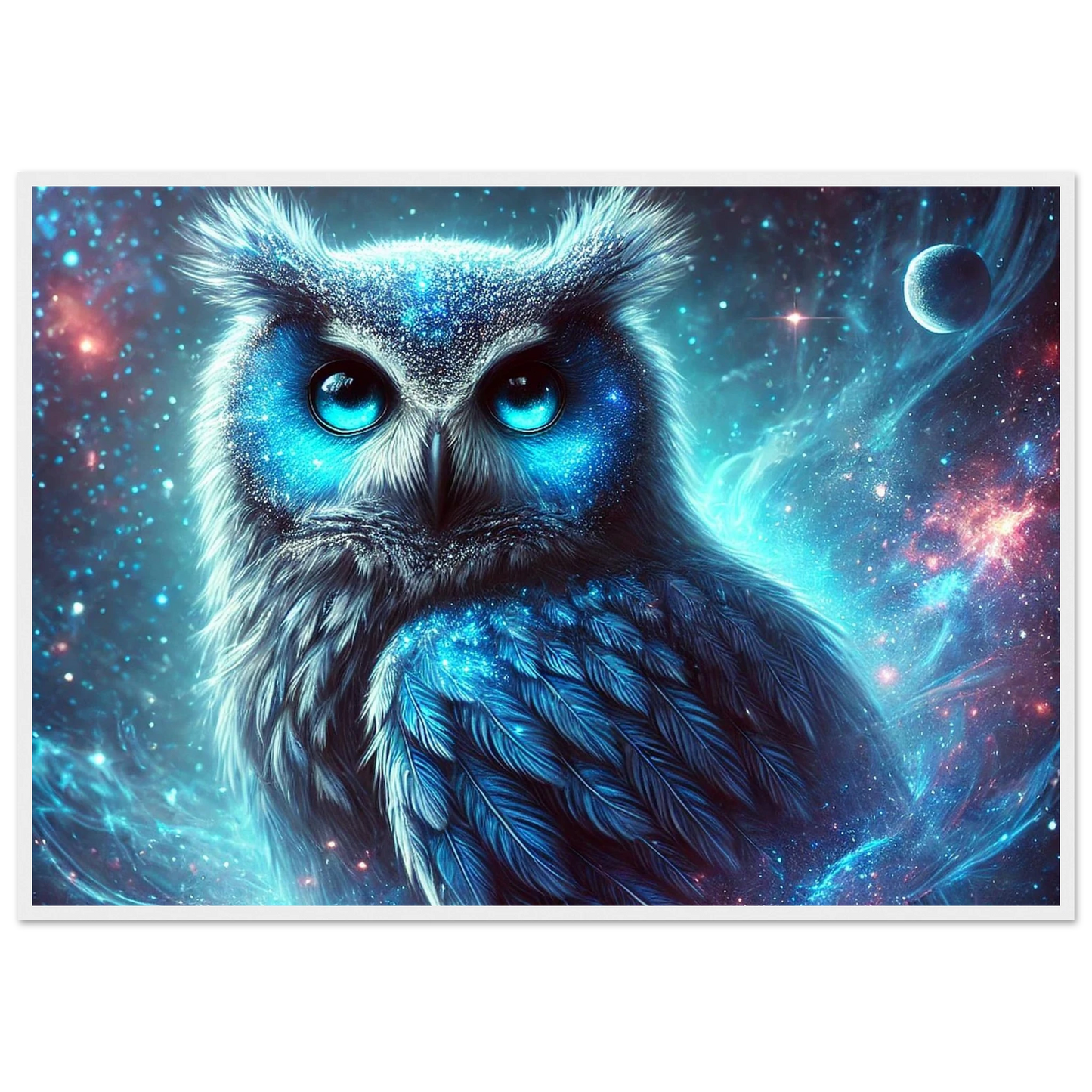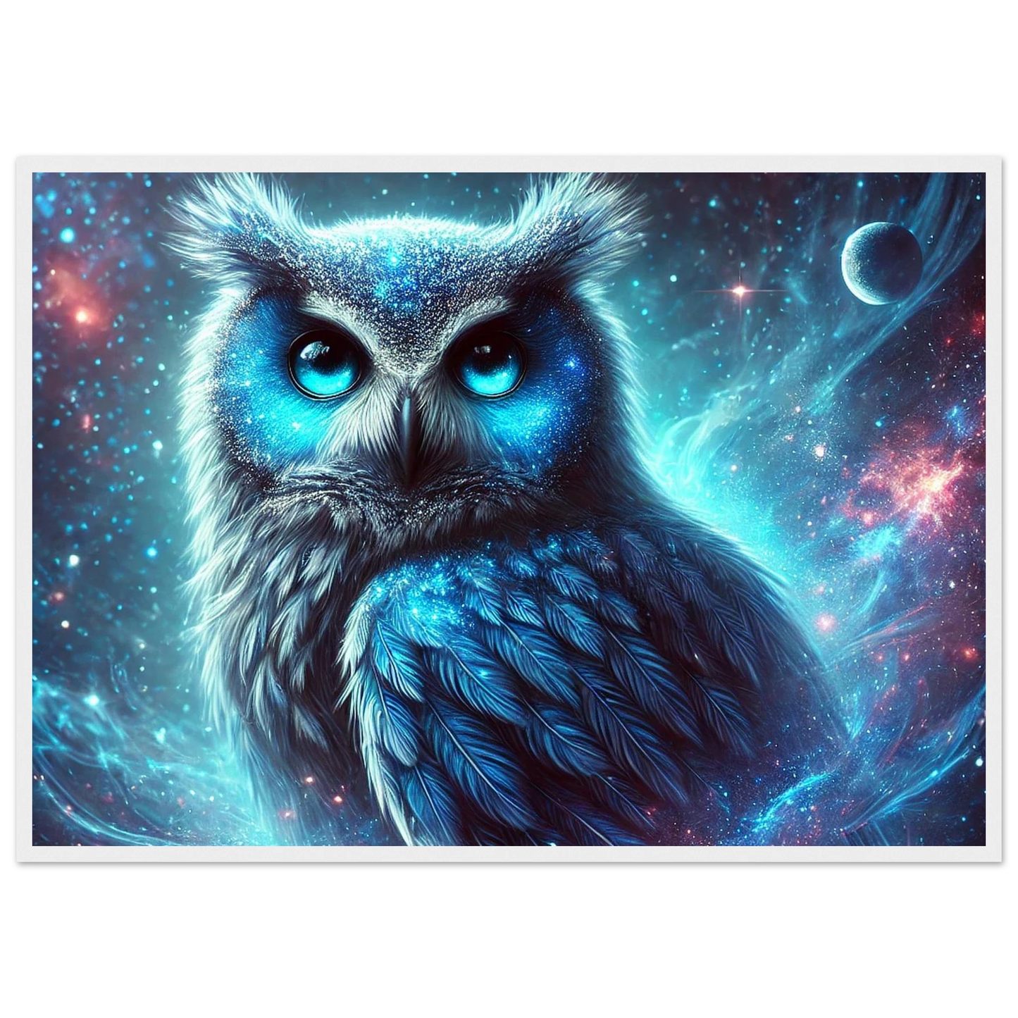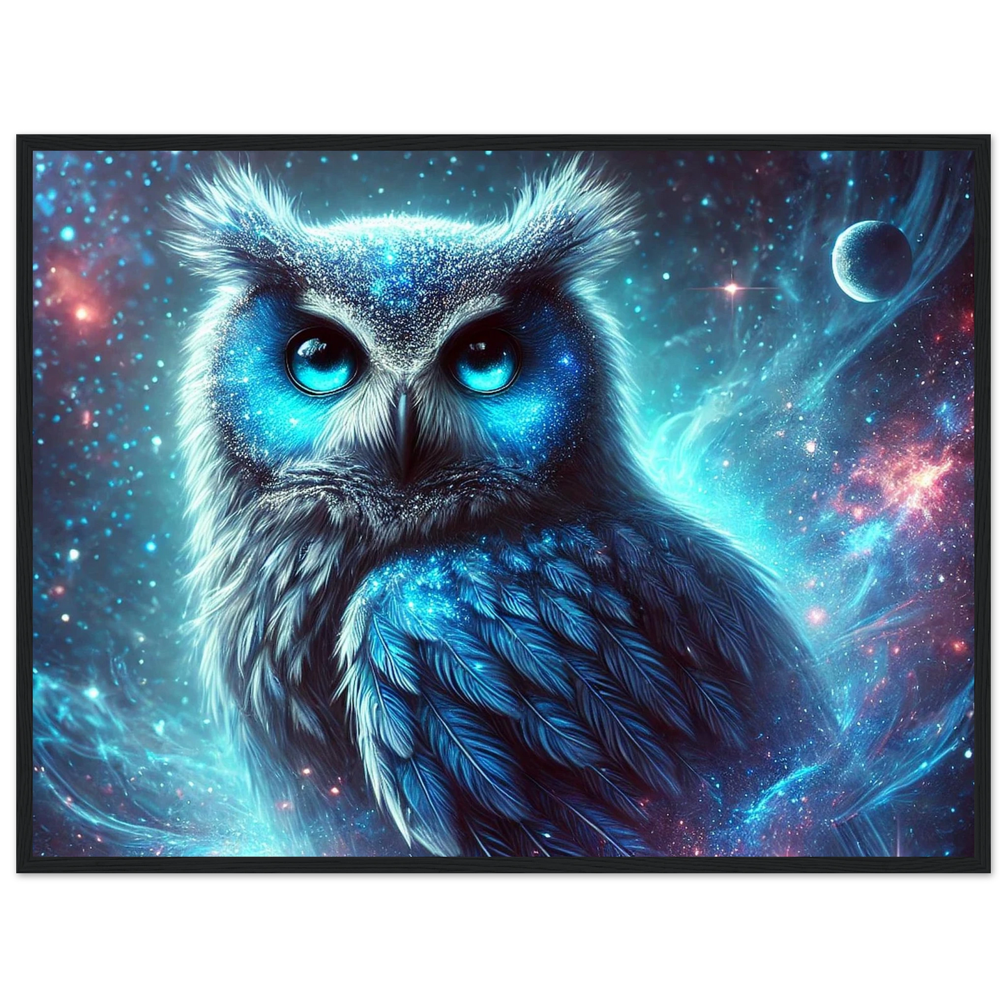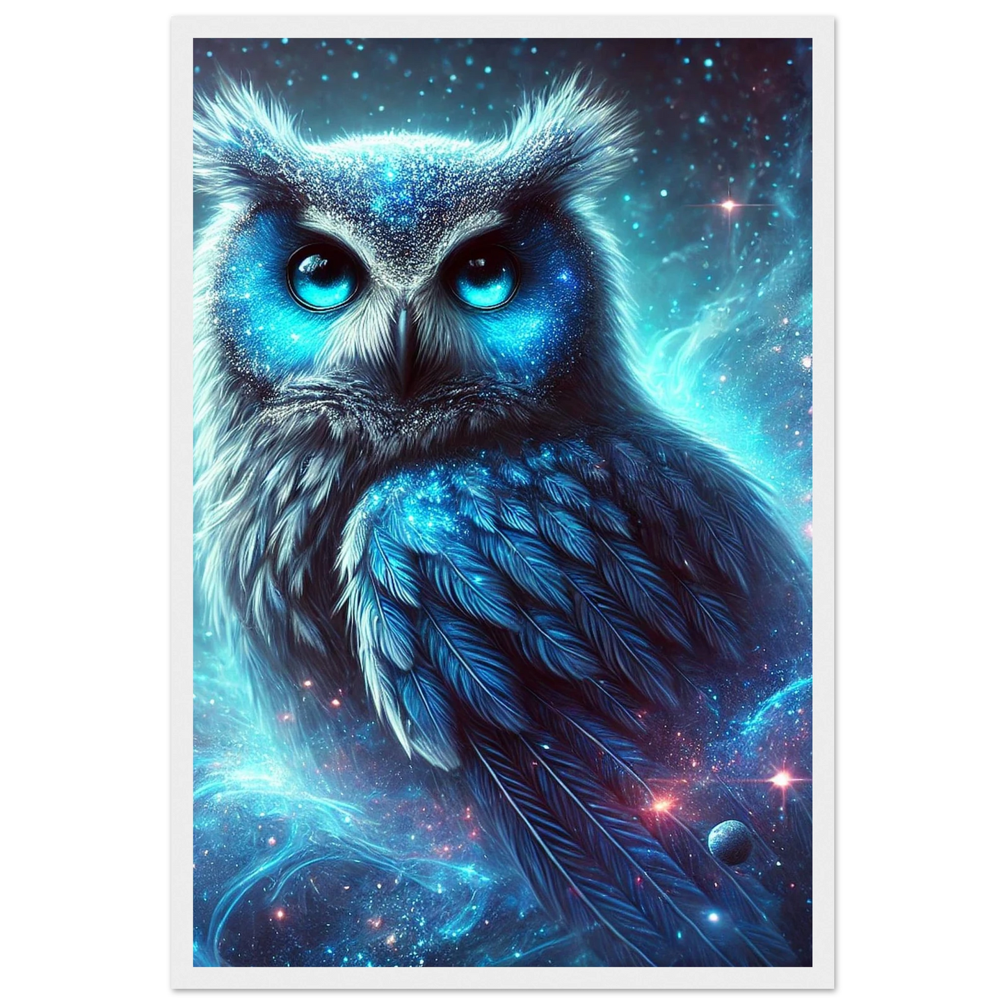 Dieser Holzrahmen-Kunstdruck vereint edle Handwerkskunst mit der kosmischen Legende von Nyxion – der Eule, die Weisheit bringt und die Sterne in dein Zuhause trägt.