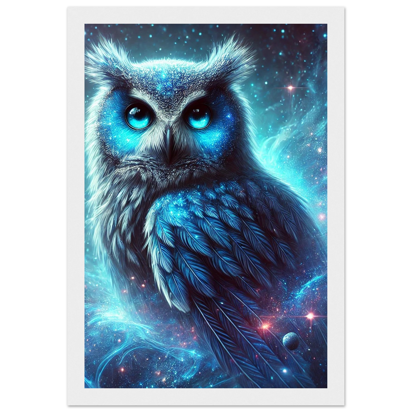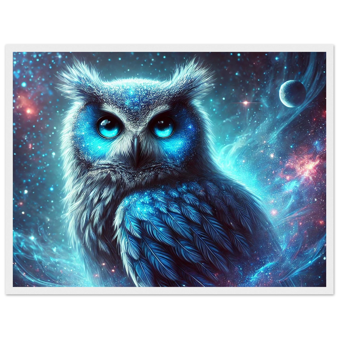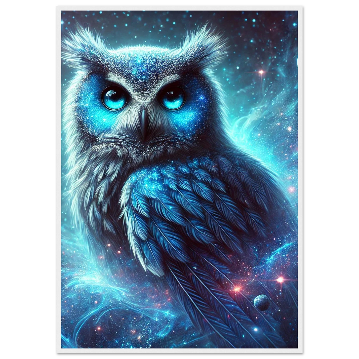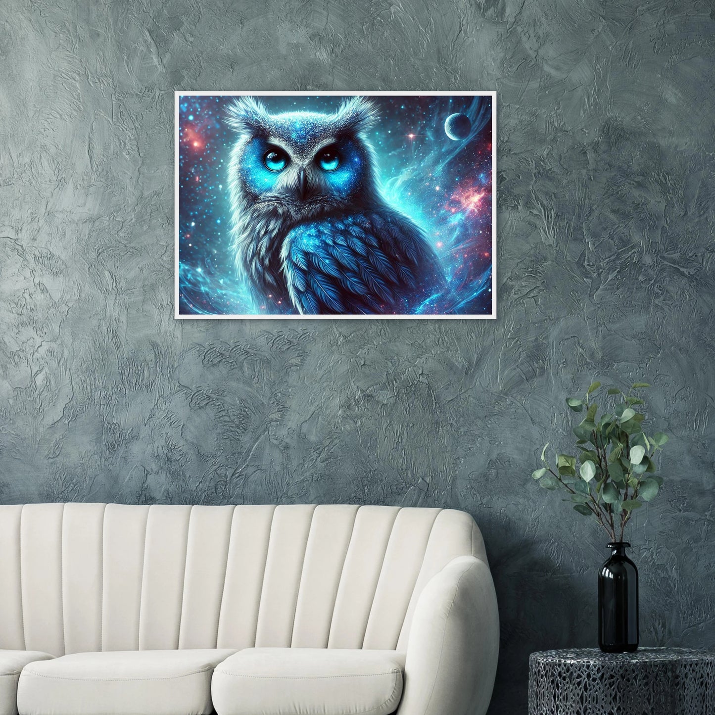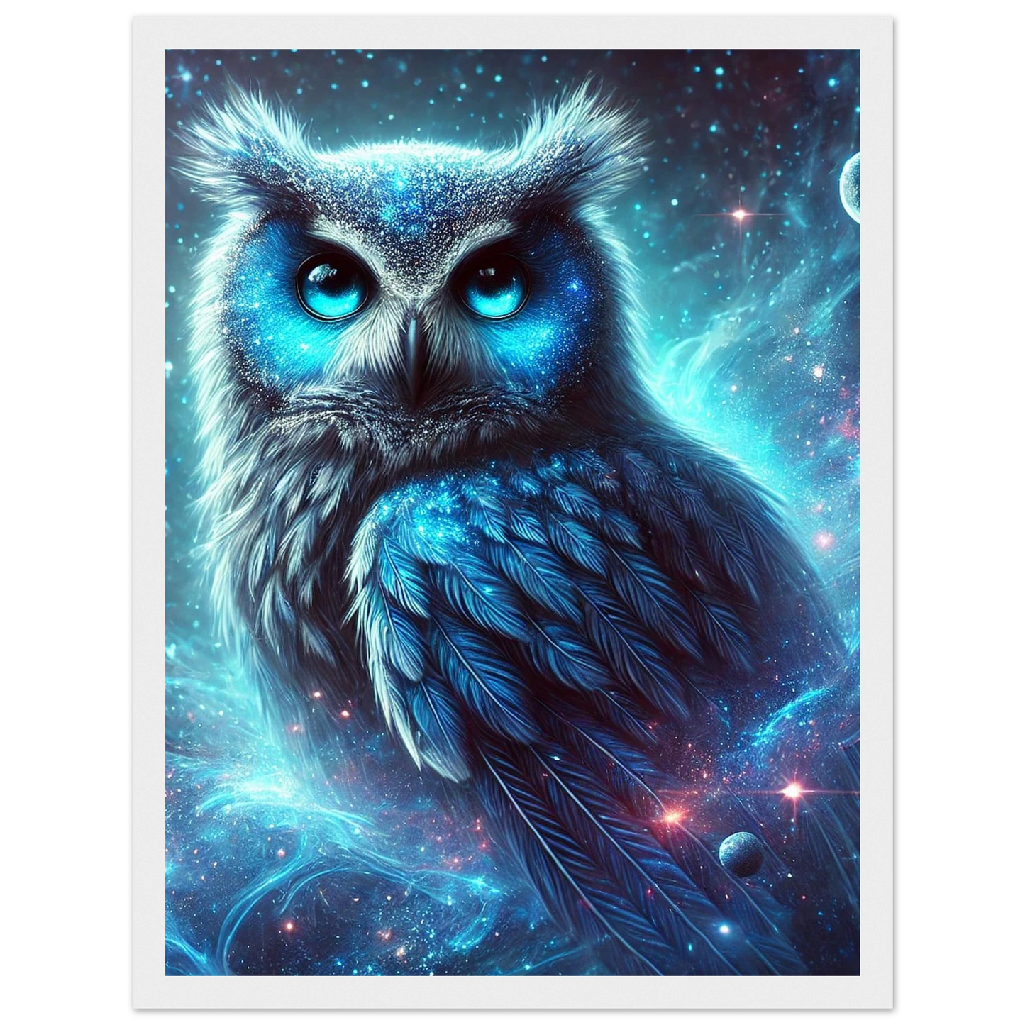 Dieser Holzrahmen-Kunstdruck vereint edle Handwerkskunst mit der kosmischen Legende von Nyxion – der Eule, die Weisheit bringt und die Sterne in dein Zuhause trägt.
