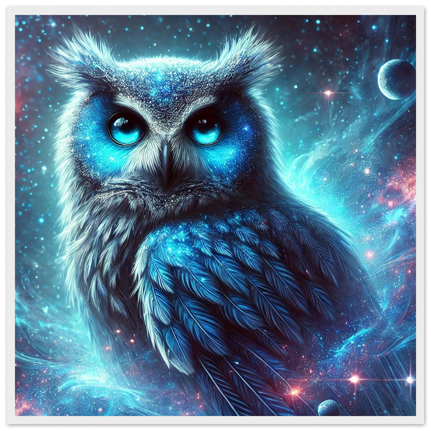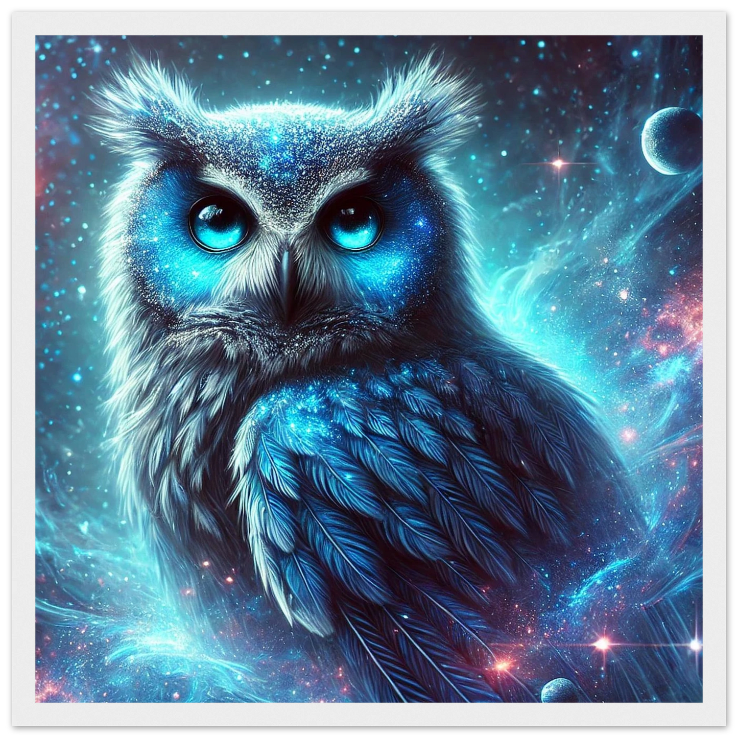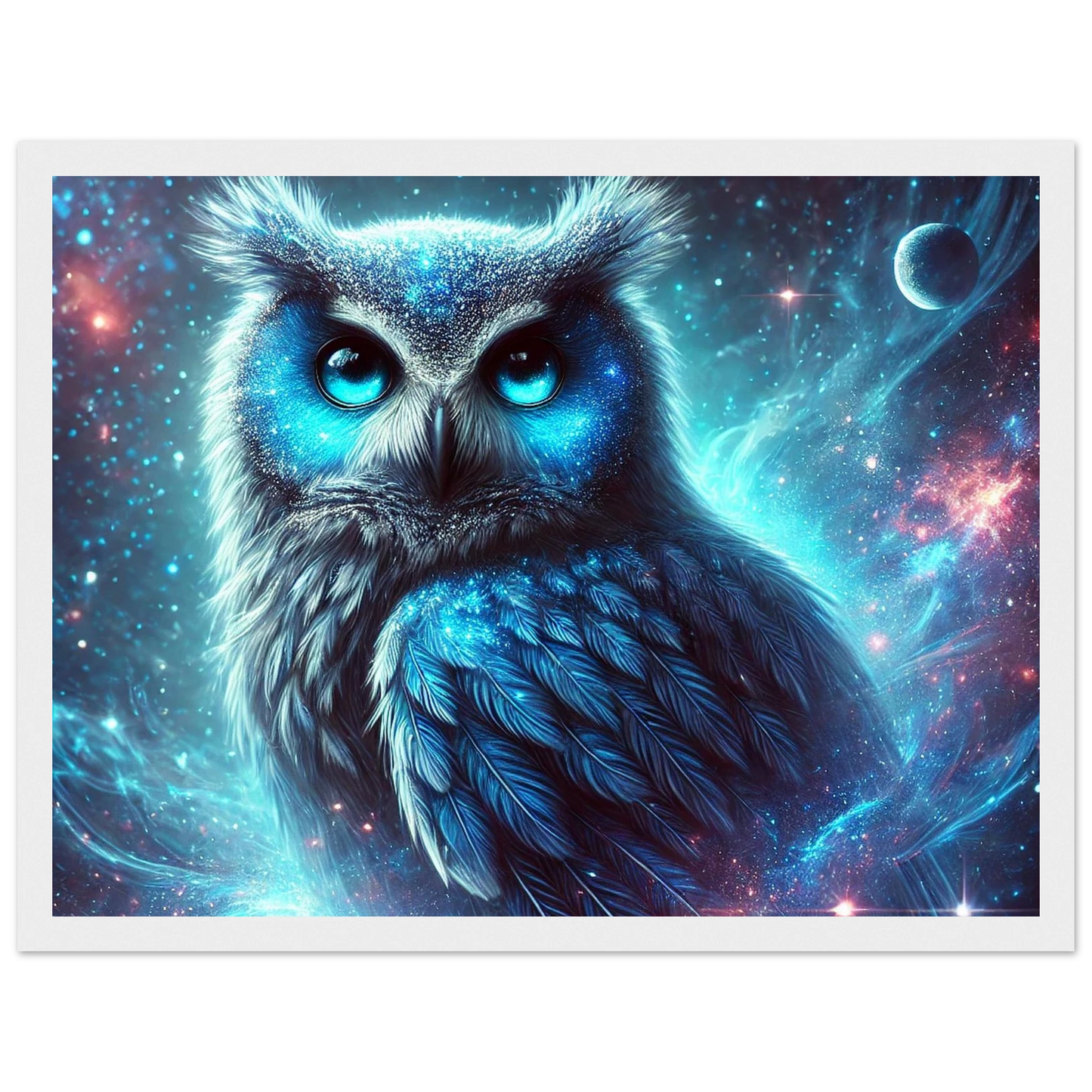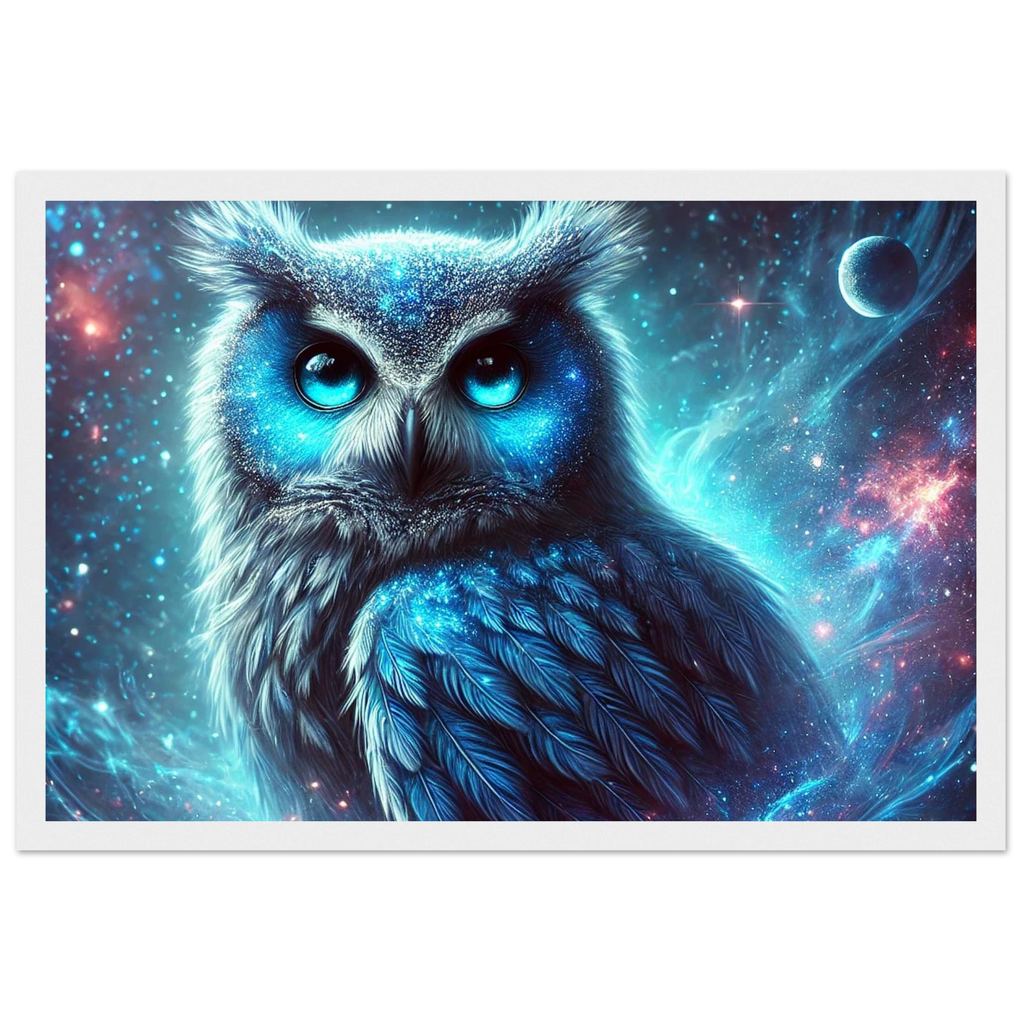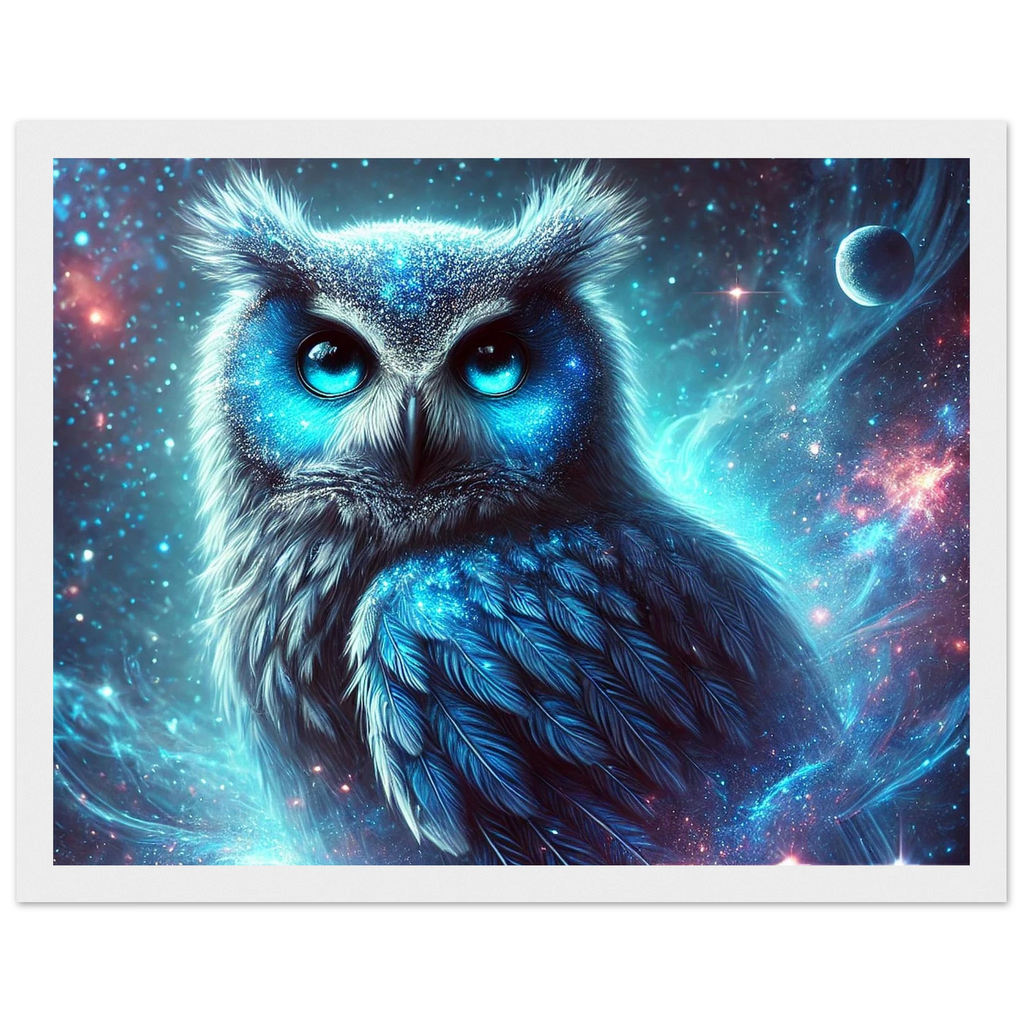 Dieser Holzrahmen-Kunstdruck vereint edle Handwerkskunst mit der kosmischen Legende von Nyxion – der Eule, die Weisheit bringt und die Sterne in dein Zuhause trägt.
