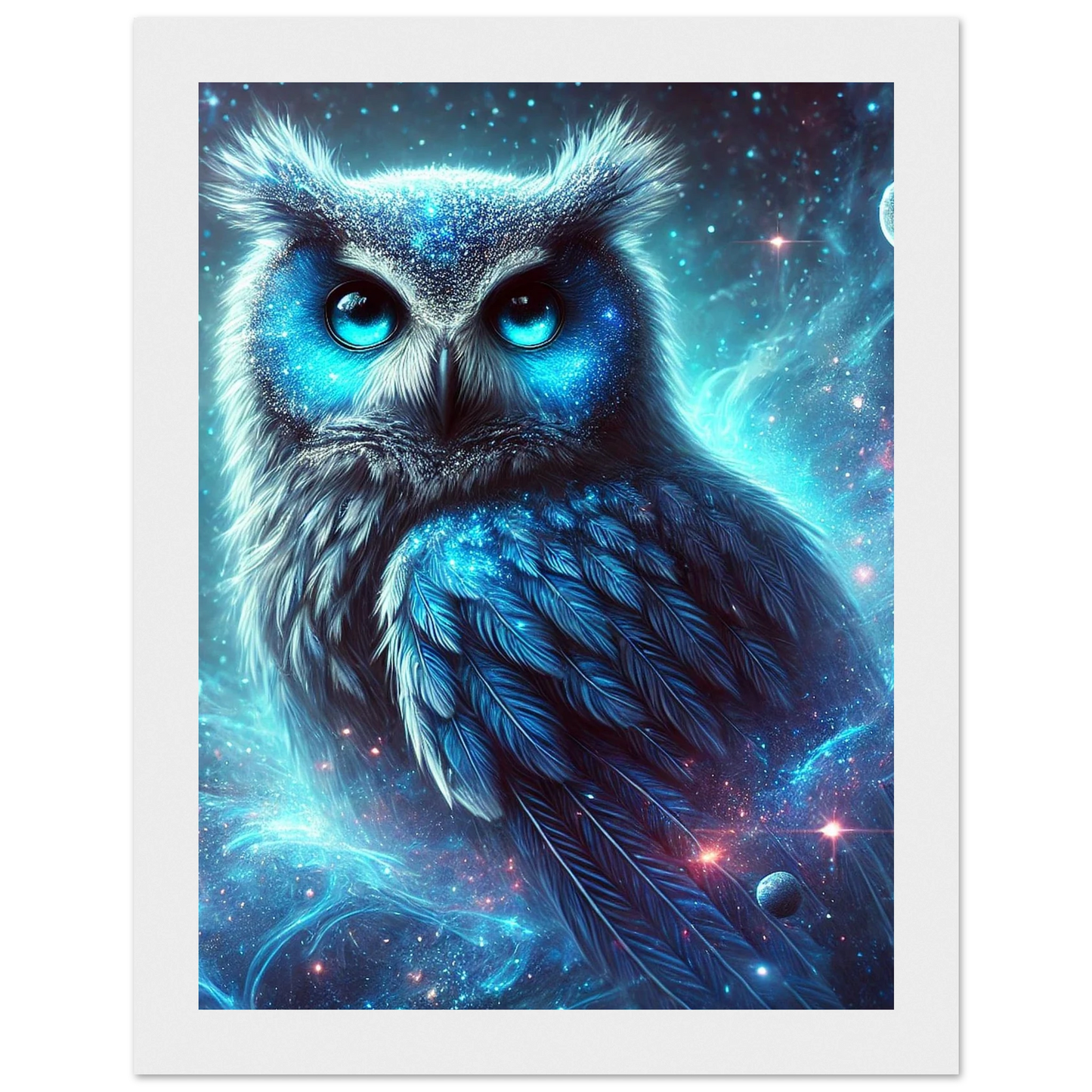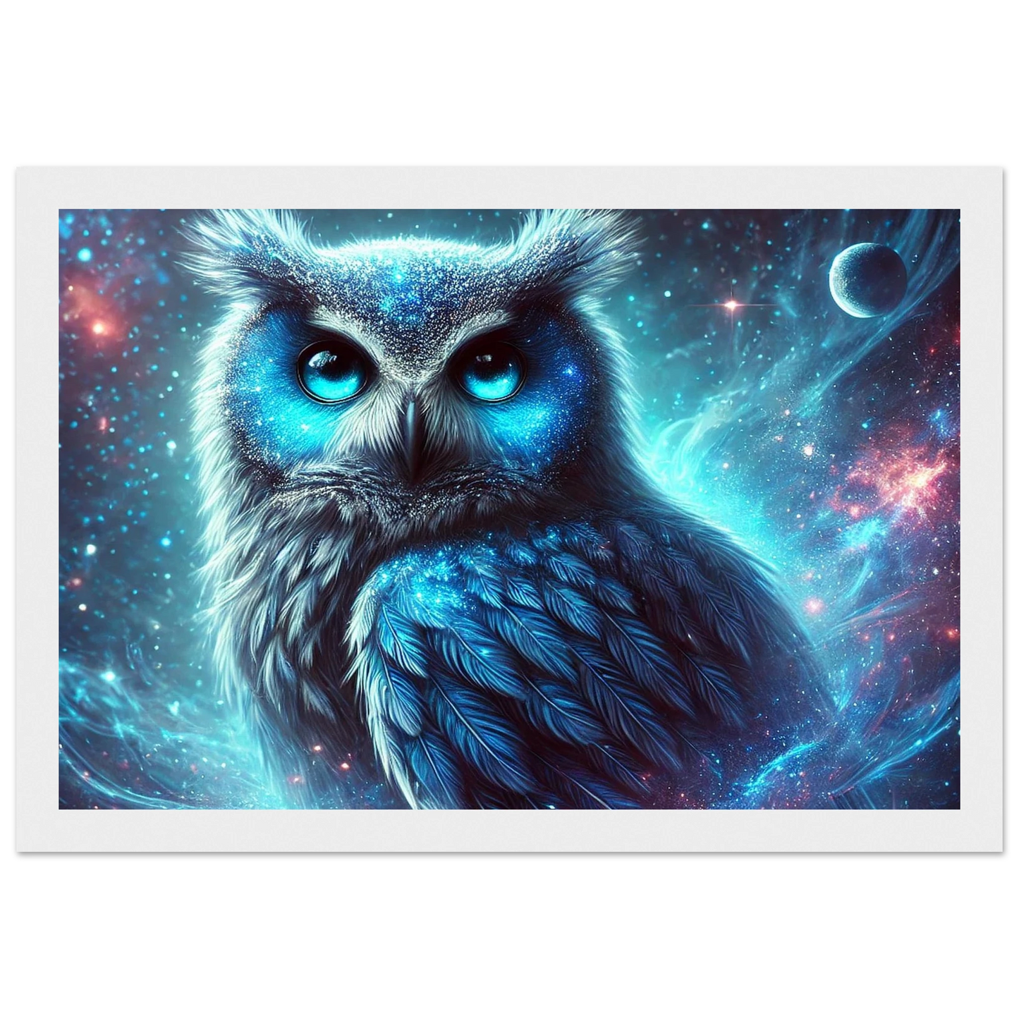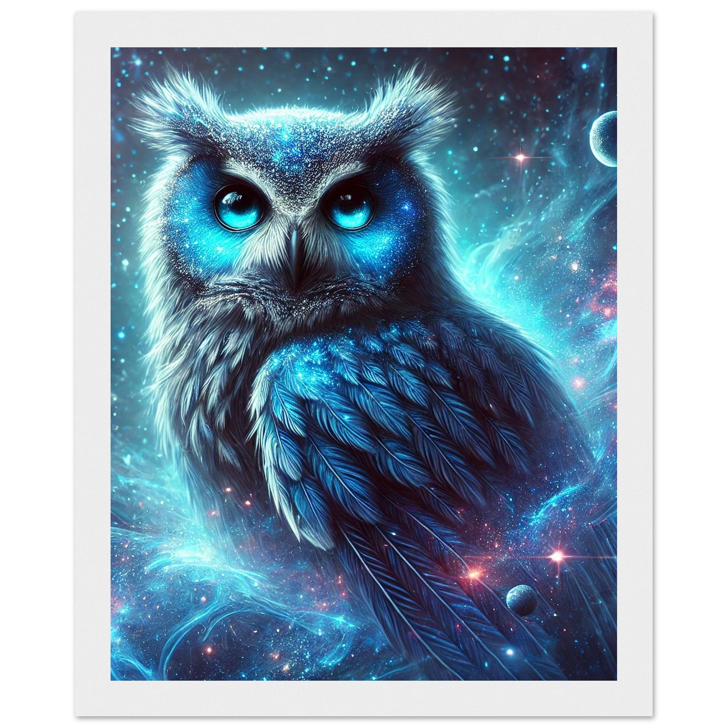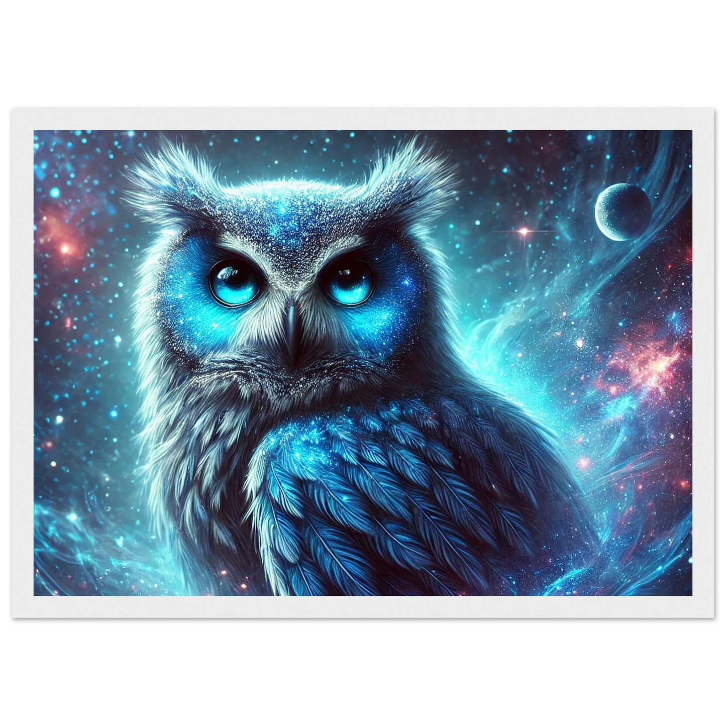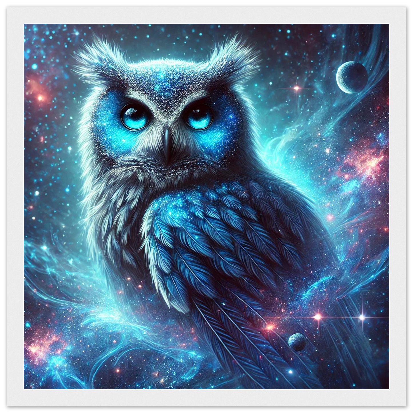 Dieser Holzrahmen-Kunstdruck vereint edle Handwerkskunst mit der kosmischen Legende von Nyxion – der Eule, die Weisheit bringt und die Sterne in dein Zuhause trägt.