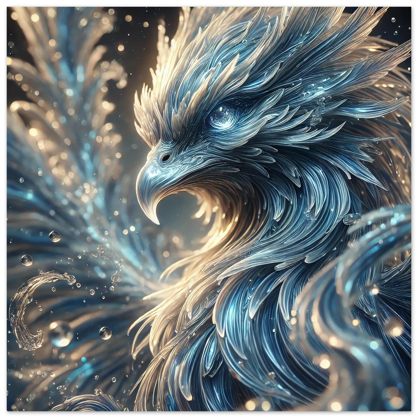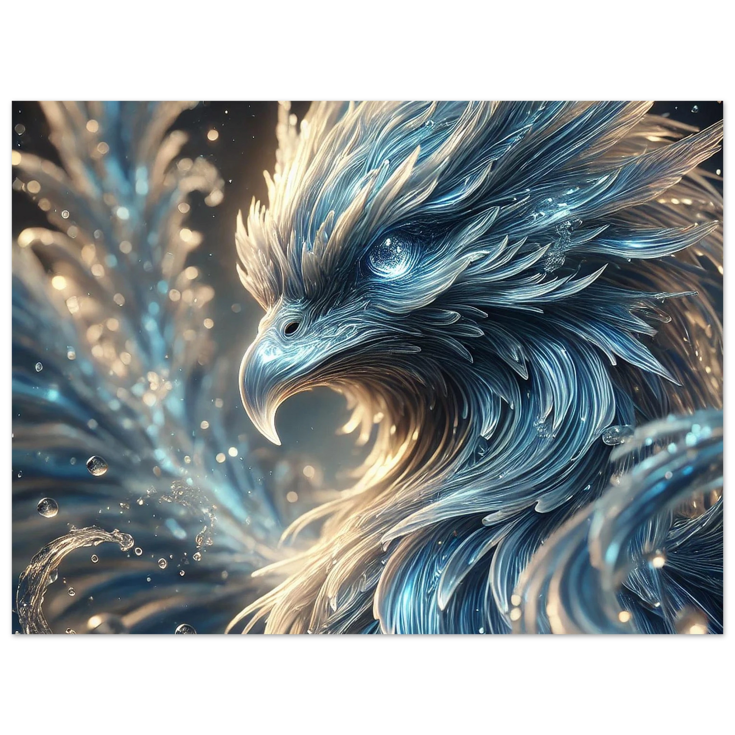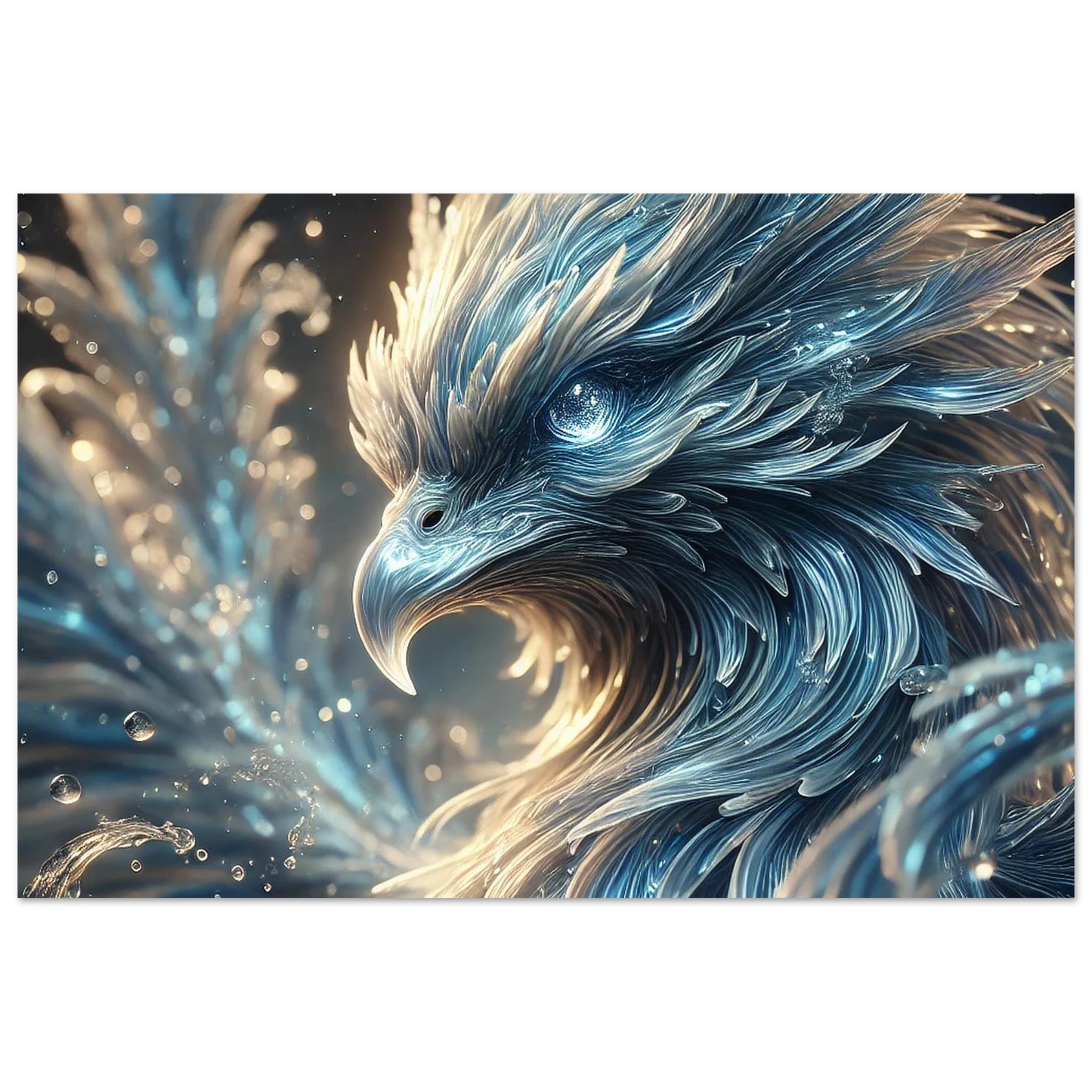 Lass den Wasserphönix Ondaris in deinem Zuhause leuchten – majestätisch, beruhigend und voller elementarer Kraft, kunstvoll verewigt auf edlem Aluminium.