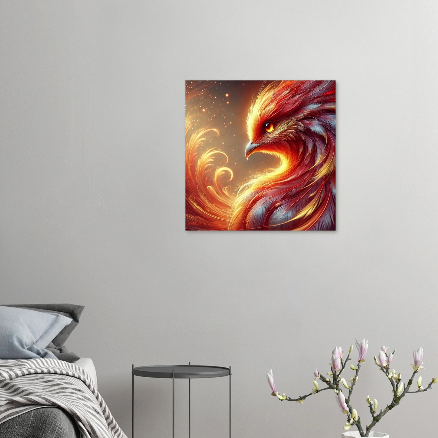 Mit seinem gold-roten Gefieder, das wie tanzende Flammen leuchtet, entfaltet Ravaryn auf einem modernen Schaumstoffdruck seine ganze Strahlkraft. Leicht, elegant und langlebig – perfekt, um jedem Raum das Gefühl eines neuen Morgens zu verleihen.