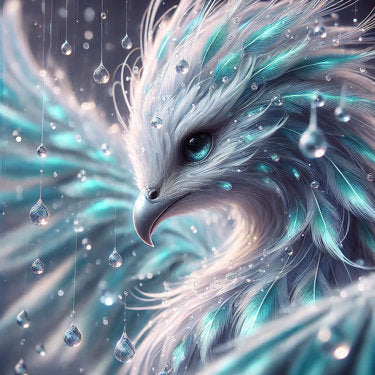 Taurya ist ein majestätisches Himmelswesen mit perlweißem Gefieder, das in kühlen Türkis- und Silbertönen schimmert. Zwischen ihren Federn hängen glitzernde Tropfen, als würde sie den Regen selbst tragen. Ihre Augen leuchten tief und still wie ein Ozean im Sturm – voller Weisheit, Trauer und Hoffnung.