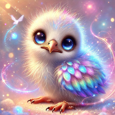 Twinkli ist ein winziges, zauberhaft leuchtendes Küken mit funkelnden, regenbogenfarbenen Flügelfedern und strahlend blauen Knopfaugen. Jeder Blick in seine Augen fühlt sich an wie der erste Blick in den Nachthimmel voller Wunder. Es scheint, als ob in jedem seiner kleinen Federchen ein Stern wohnt.