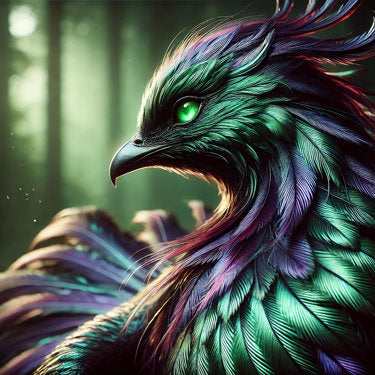 Zeyrion ist ein majestätischer, tiefgrün-violett schimmernder Vogel mit einem durchdringend smaragdgrünen Blick. Sein Federkleid fließt wie Seide im Wind des alten Waldes, den er mit uralter Kraft beschützt. Er ist weder ganz Tier noch ganz Geist – sondern ein lebendes Naturwunder, das zwischen den Schatten der Bäume und dem Glanz der Morgendämmerung wandelt.